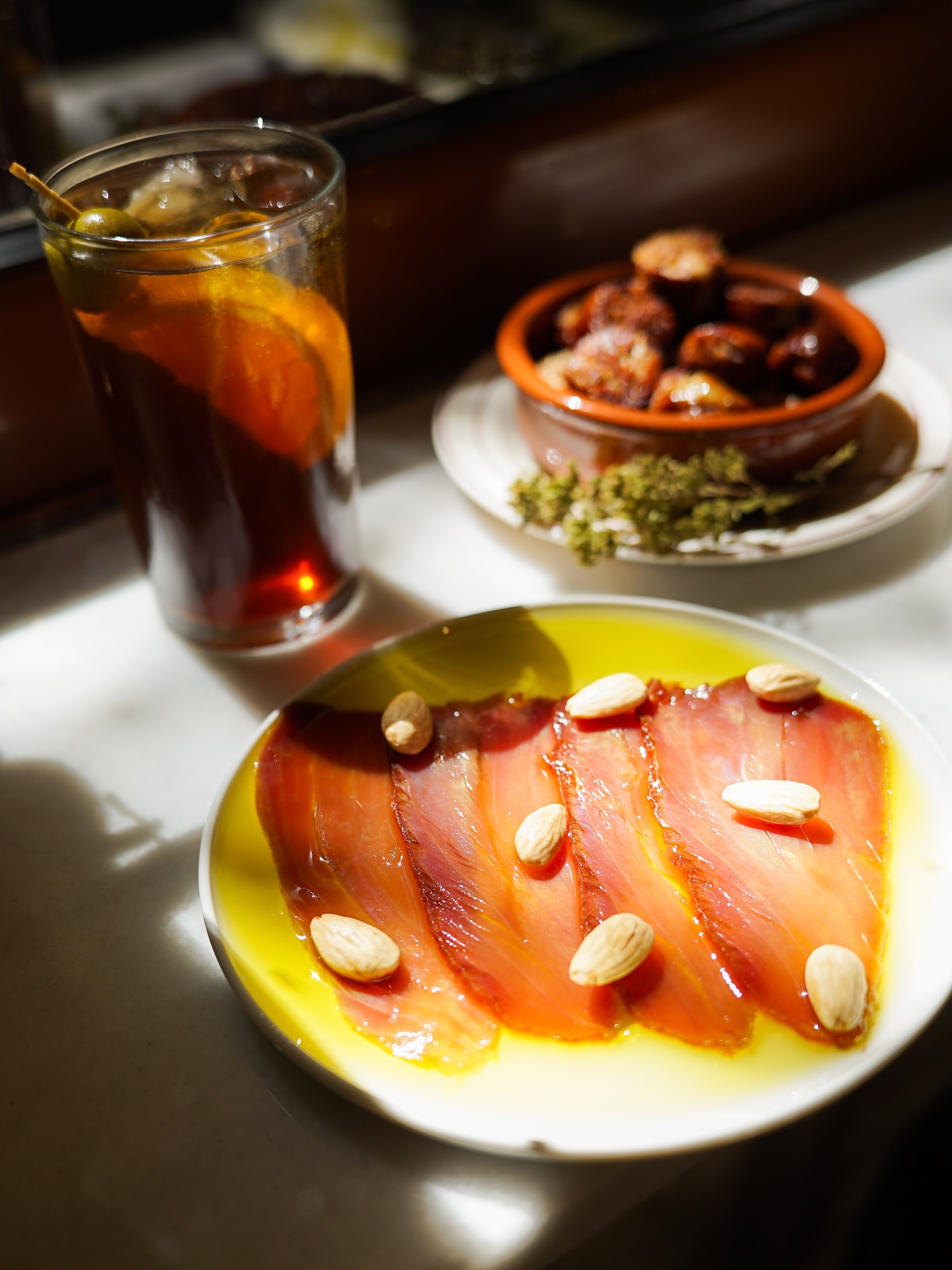 The menu is designed for movement rather than sequence. Chickpeas with squid circulate easily across tables, while the Basque-style cheesecake made with local cheeses often appears later in the evening. The space supports long conversations and shared ordering, with a crowd that favors groups. Drinks follow Mediterranean logic: vermouth served neat or over ice sets the tone, followed by cider or a straightforward gin and tonic chosen to match the food.
