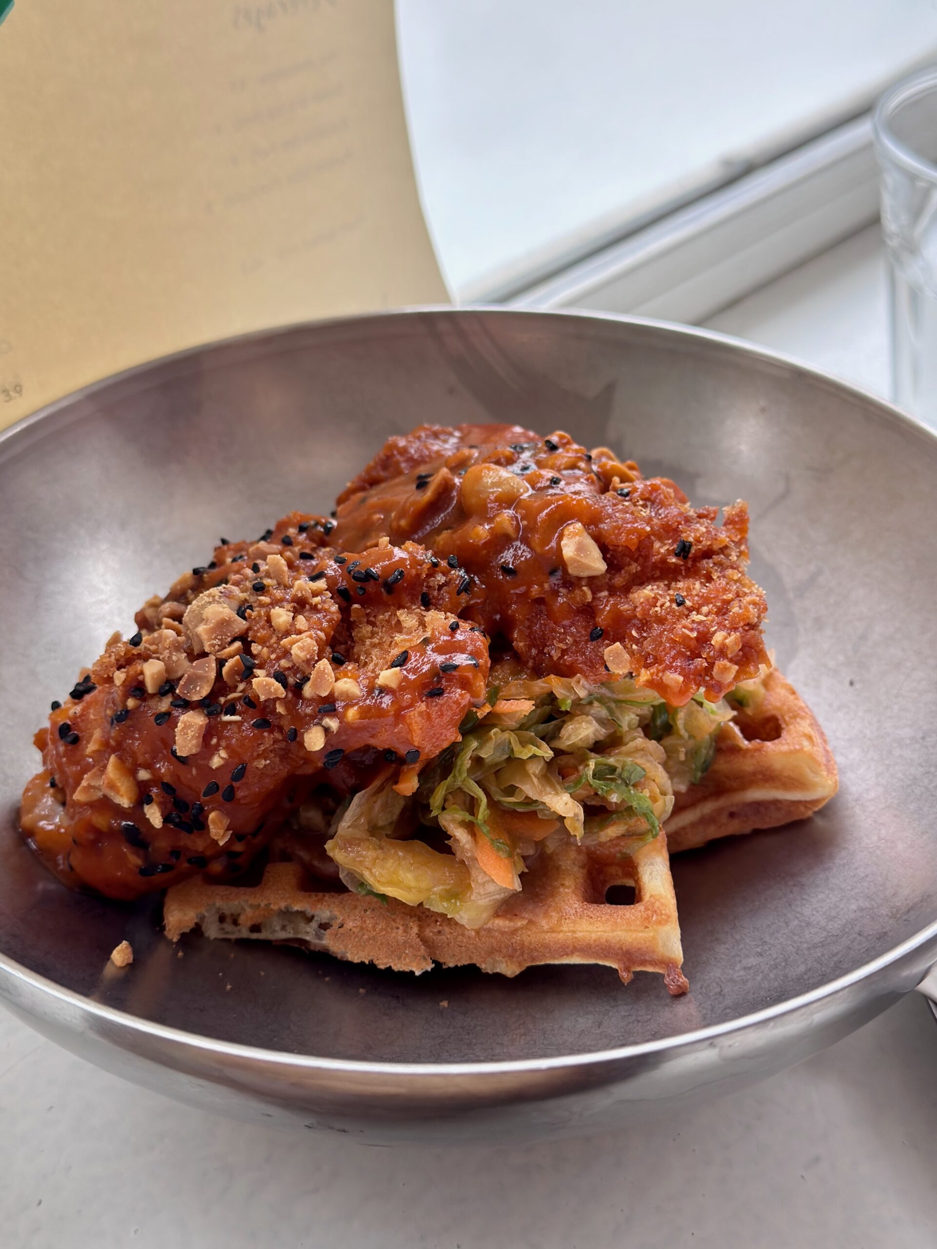 Brunch runs as an all-day format with walk-in seating and a full drinks list alongside coffee and fresh juices. The current menu includes Eggs Benedict on sourdough with hollandaise and a choice of sautéed spinach, bacon, or smoked salmon; shakshouka eggs with tomato and bell pepper sauce, feta, cumin, basil and sourdough; and a steak open sandwich with tri-tip Black Angus, smoked cheese, caramelized onions, rocket and mayo. There are also sweeter plates such as blueberry pancakes with mascarpone cream, red berries and maple syrup, plus larger plates that sit well as a late lunch, including a buttermilk chicken waffle with fried chicken and egg, pickles, salad and maple syrup. Opening hours are listed as 07:30–18:00 on weekdays.