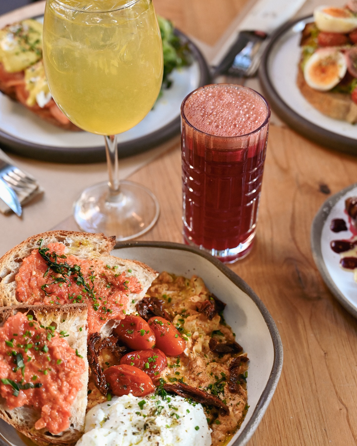 A nod to Fellini’s cinematic world, Zampanó in Psyrri channels retro elegance with warm lighting, vintage details, and jazz spinning on vinyl. The brunch menu blends classic European elements with Greek flavors: strapatsada, fluffy scrambled eggs folded with feta and fresh tomatoes, is served on rustic sourdough, while a croque madame combines buttery brioche, melted graviera, and crisp bacon. Classic cocktails like mimosas and Bloody Marys complete the leisurely, old-world brunch experience.