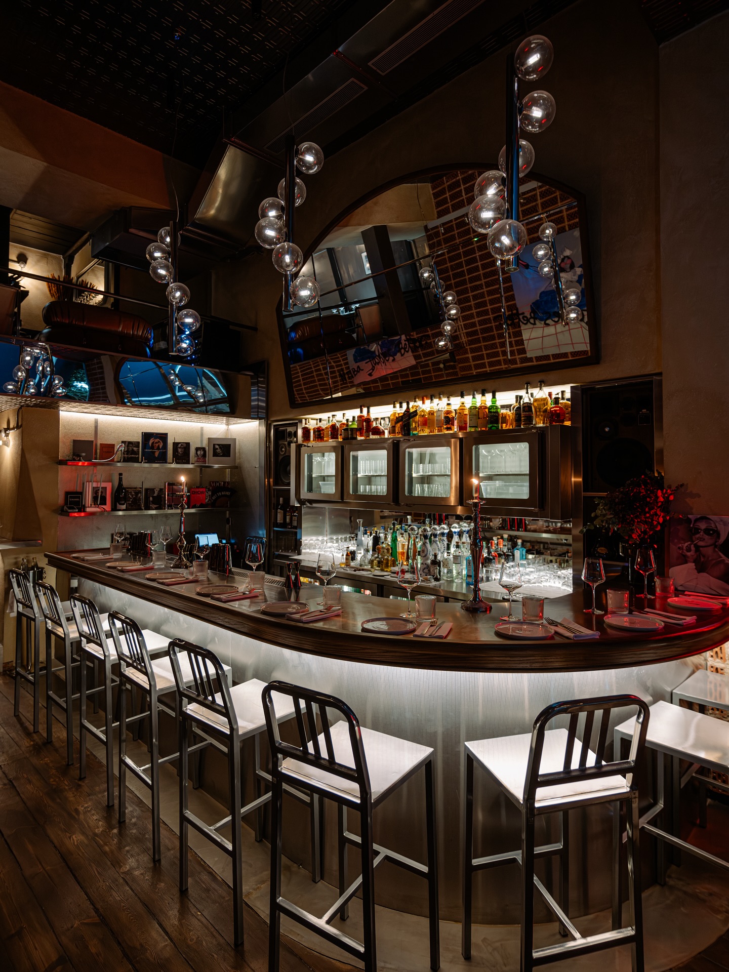 This upscale, underground steakhouse combines gastronomy with a cinematic ambiance featuring gold details and contrasting tones. Signature items include olive-fed Wagyu Tomahawk steak, American T-bone, and Armenian kebab, paired with an extensive wine selection.
