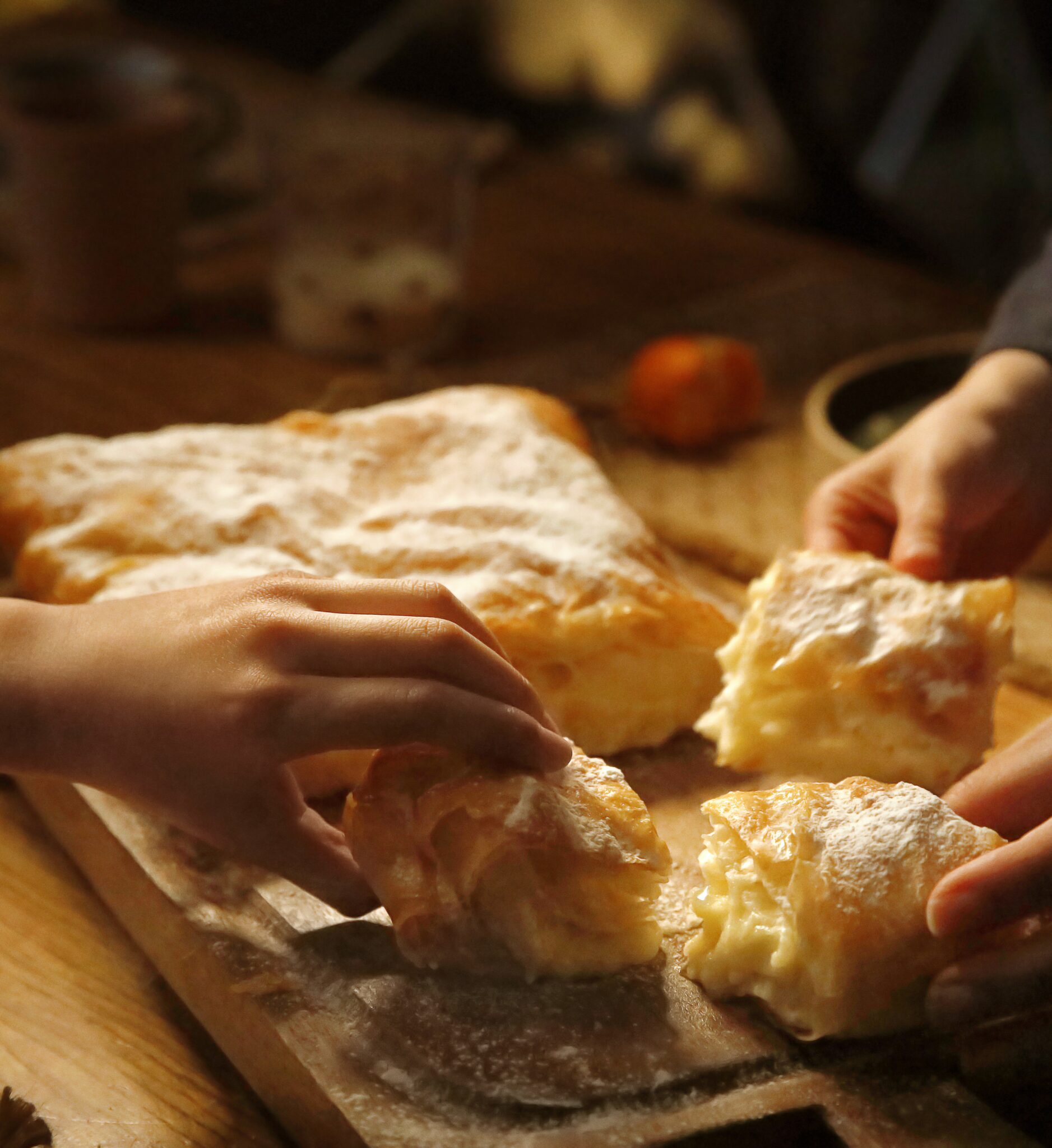 Nowadays the choices are many. The crispy pastry is filled with cheese, minced meat or other savoury stuffing, but also with sinfully sweet fillings such as hazelnut chocolate praline or vanilla custard, baked until golden and then dusted with icing sugar and cinnamon.