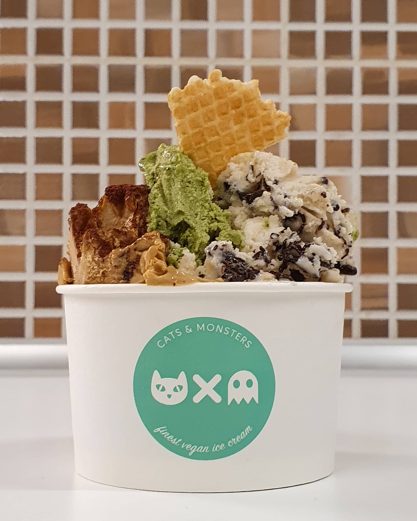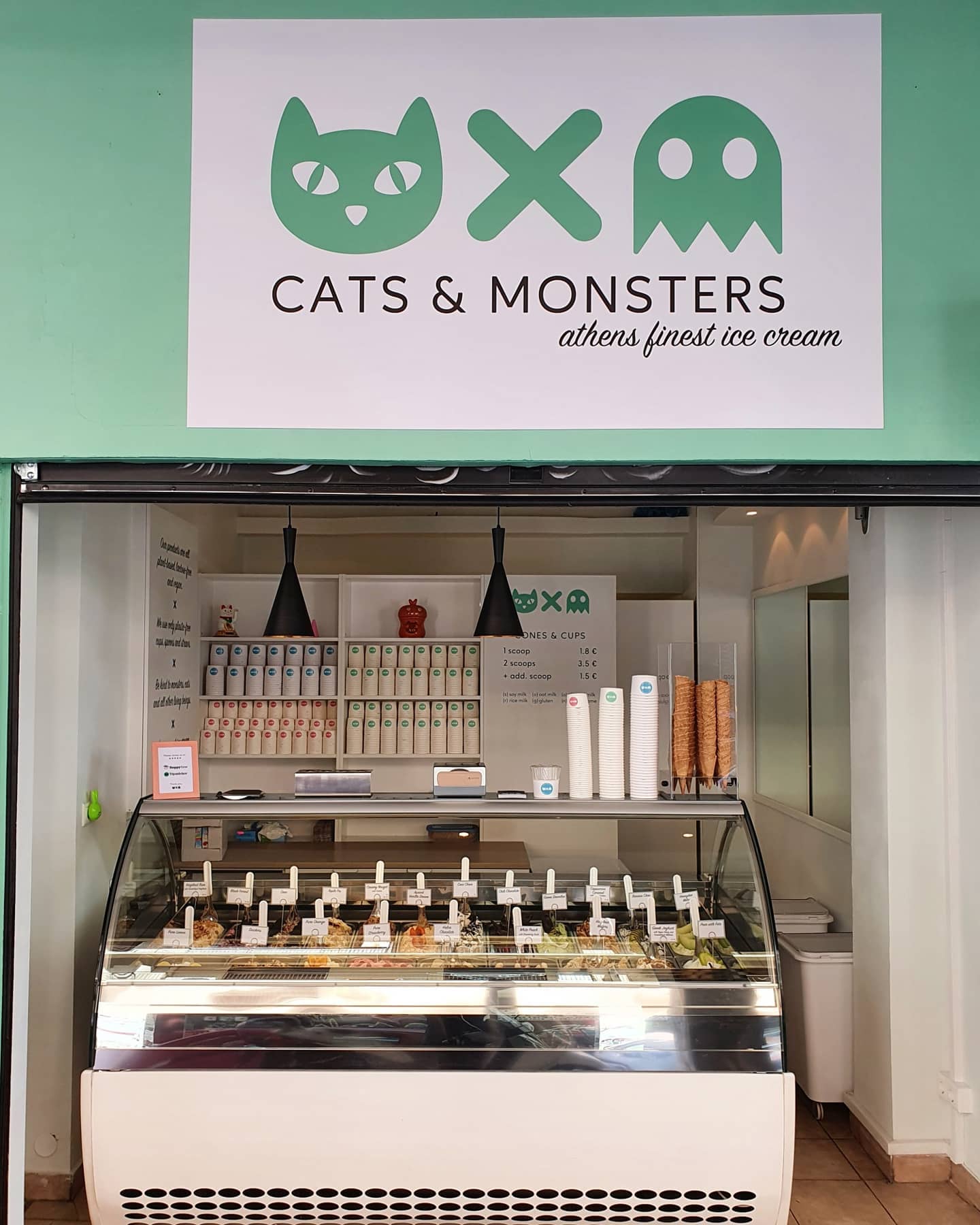 The selections looked very tempting, so I asked to try, even though I was running late for an appointment. Up until that point, I had not paid any attention to the little tags with the flavours inscribed on them, as well as the type of milk used to make the ice cream. To my surprise, I realised that this little shop with the large freezer-window display produces ice cream using plant-based milks. Cats & Monsters, as the shop is called, is Athens’ first ever vegan ice cream shop.