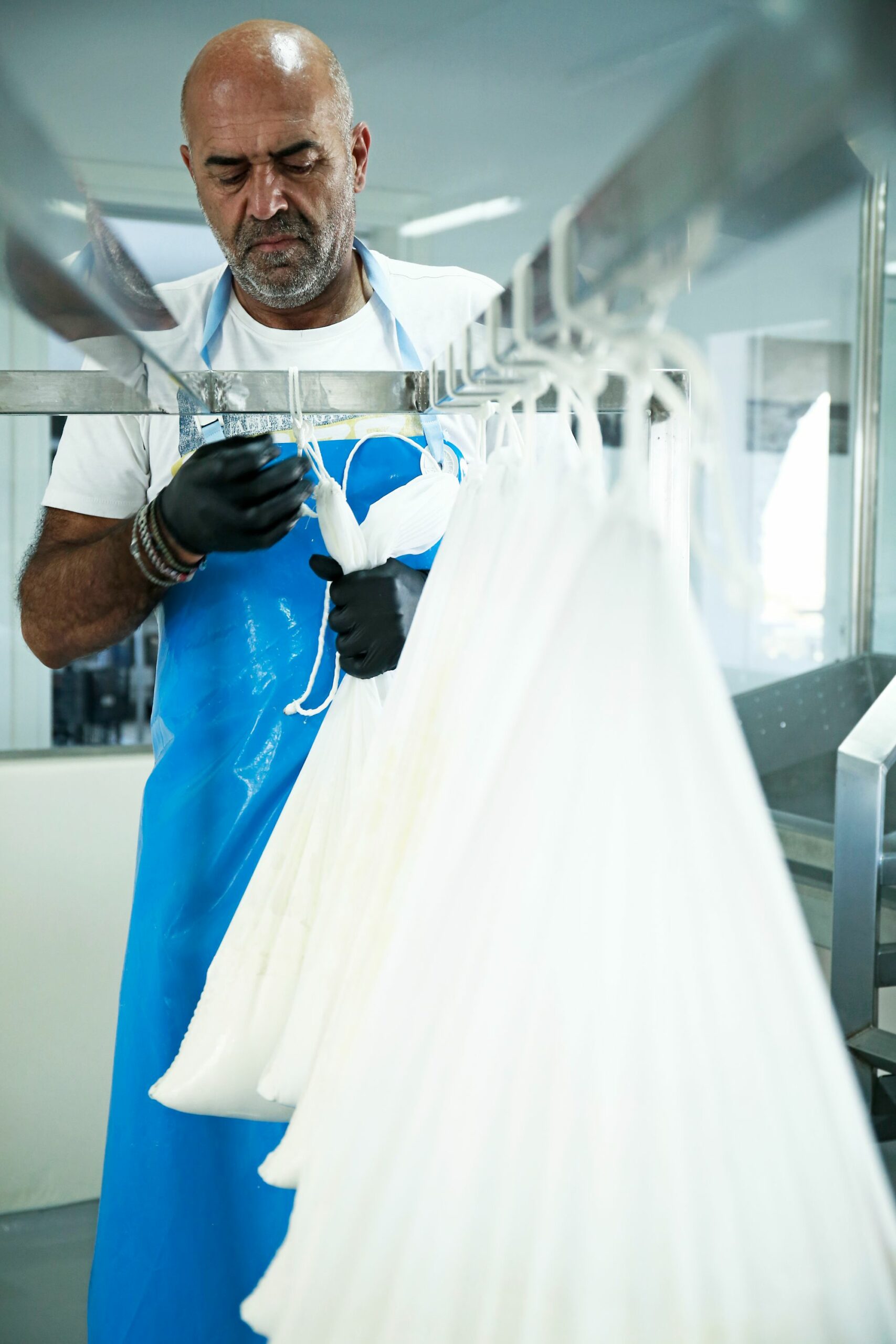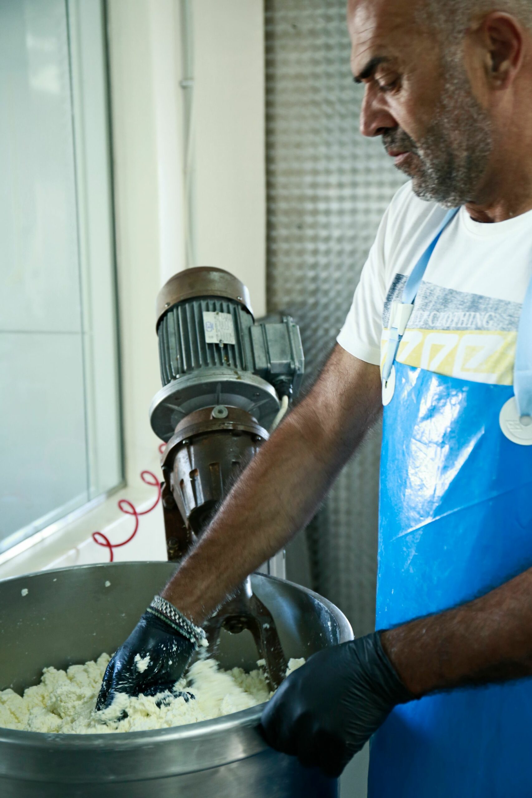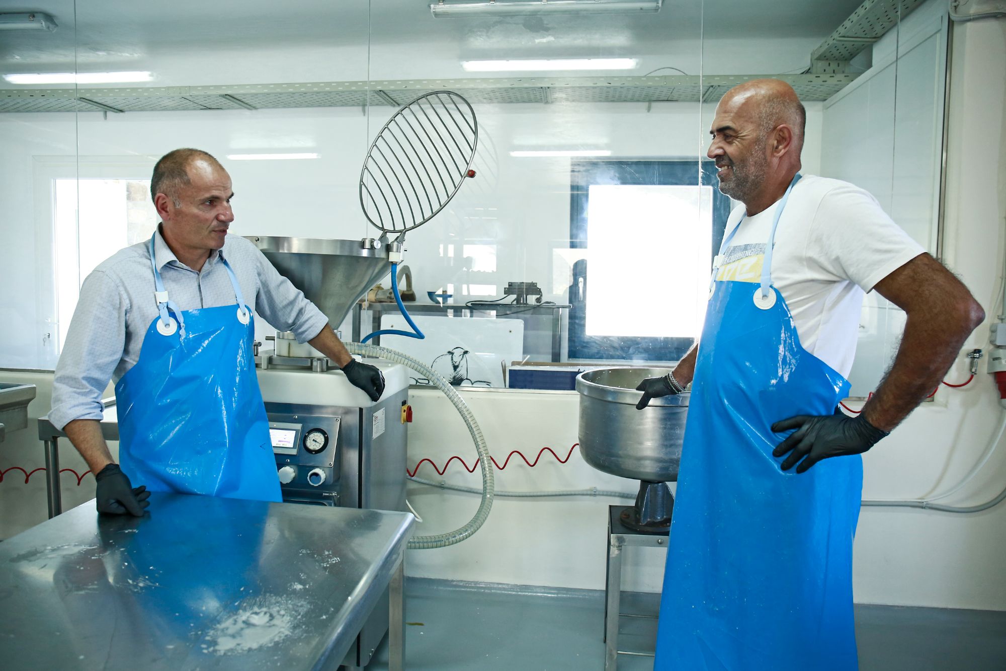 In between our conversation, while savouring this wonderfully thick, rich smell of milk and its fermentation, George’s phone rings and he can’t answer it because he’s wearing gloves full of cheese. Athanas holds the phone to George’s ear, tenderly revealing this friendly and professional coexistence.