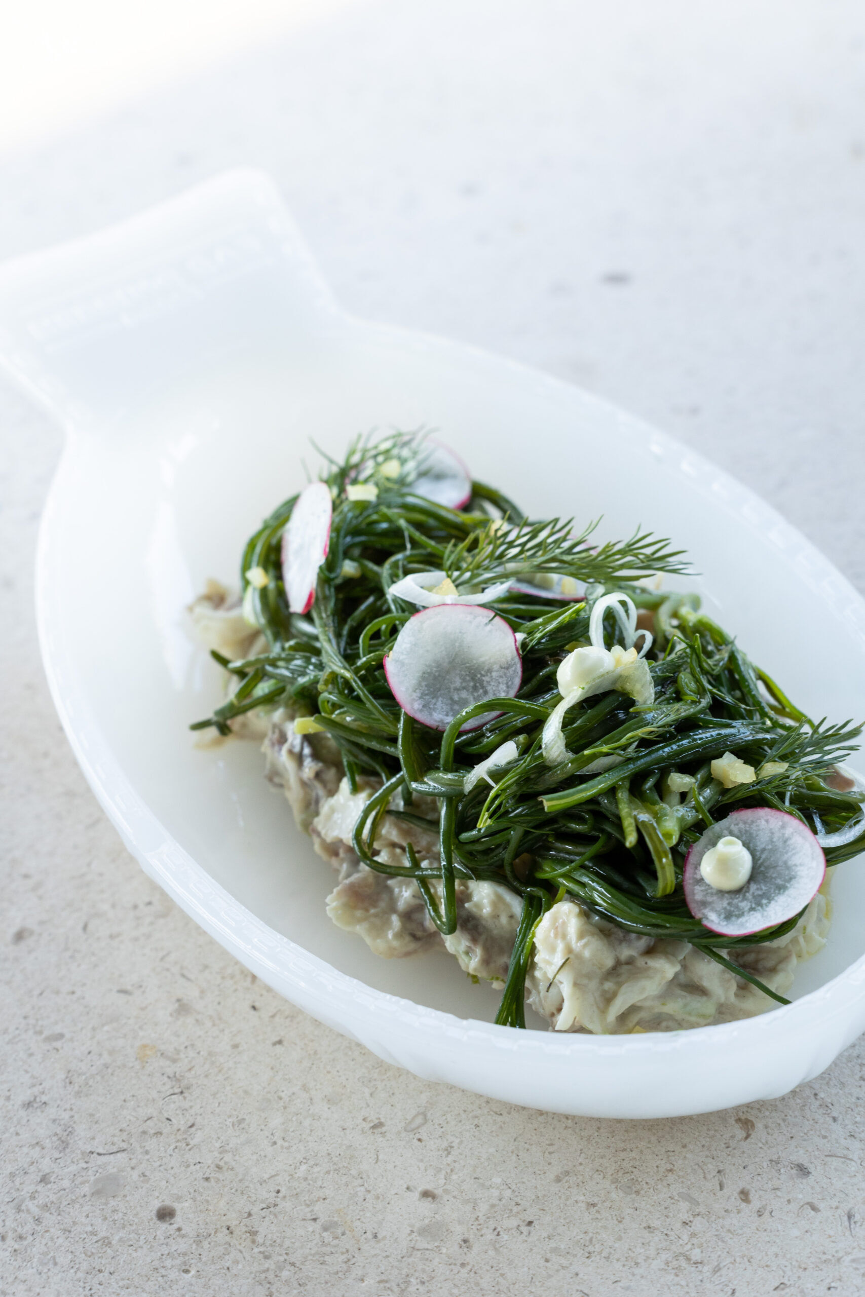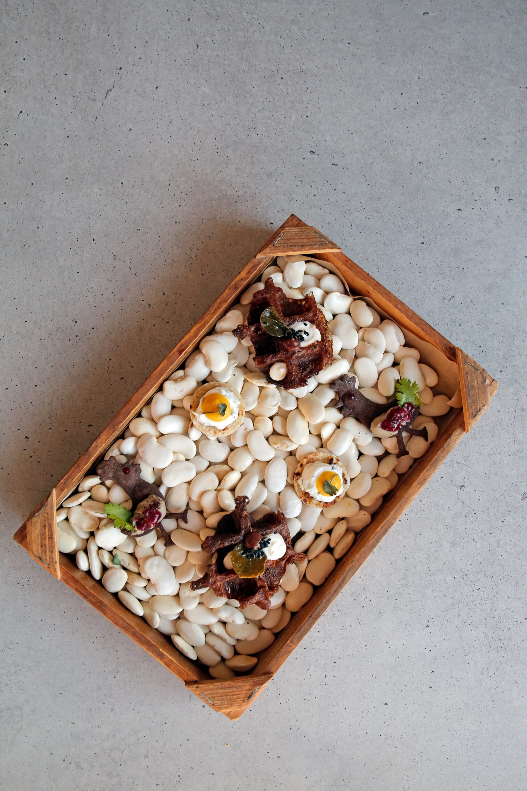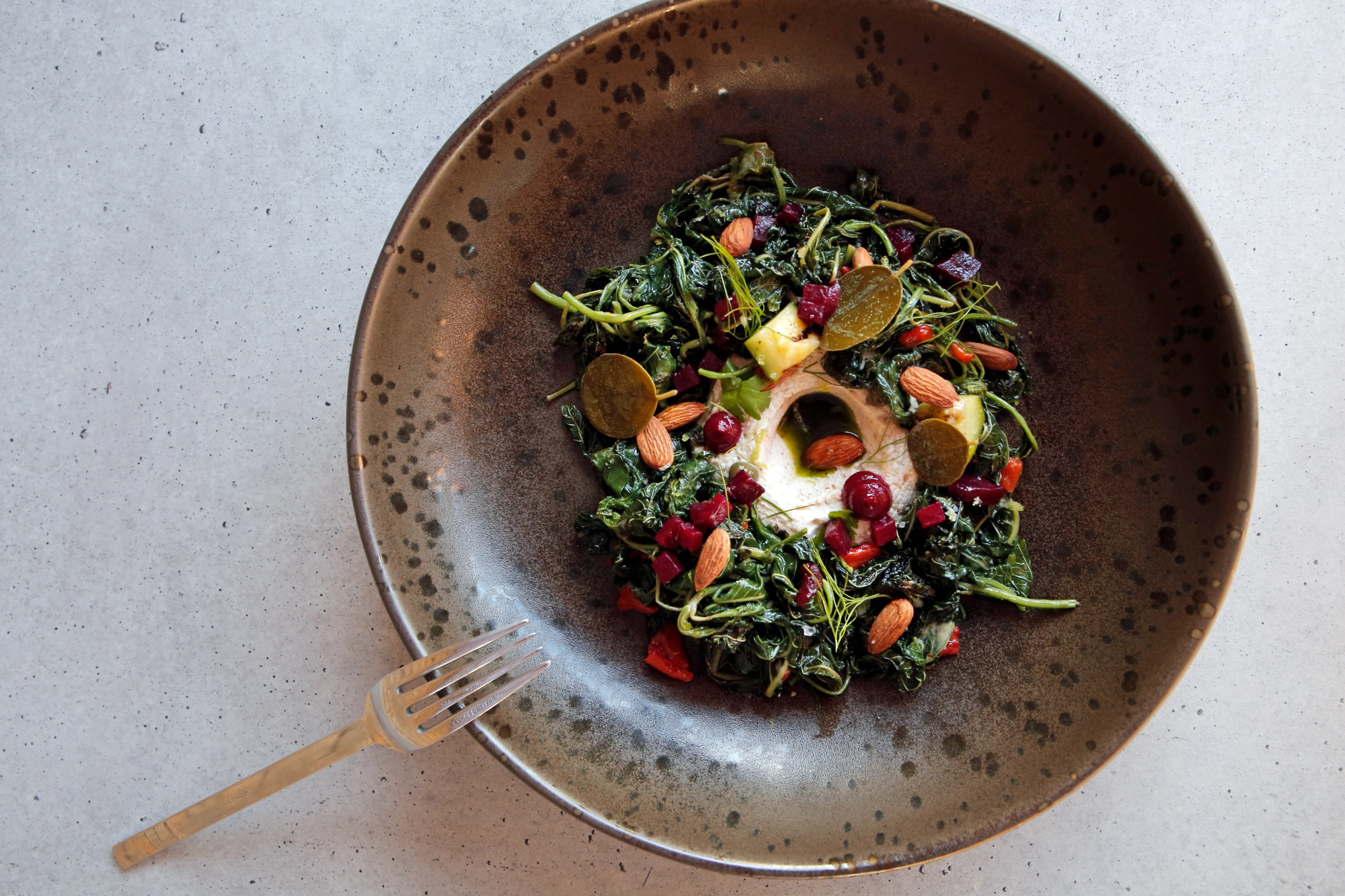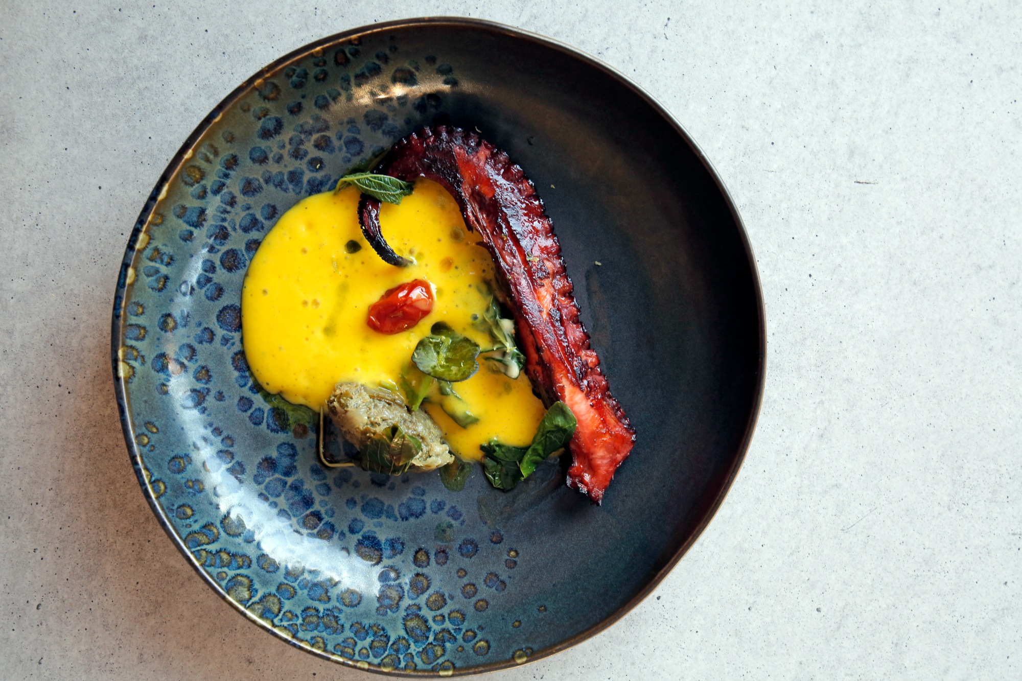 Artichokes of Tinos with smoked eel and yuzu mayonnaise, salad with asparagus, vinegar, basil pesto, and chili peppers, pumpkin tempura, lamb Lollipops marinated in yogurt sauce and accompanied by eggplant