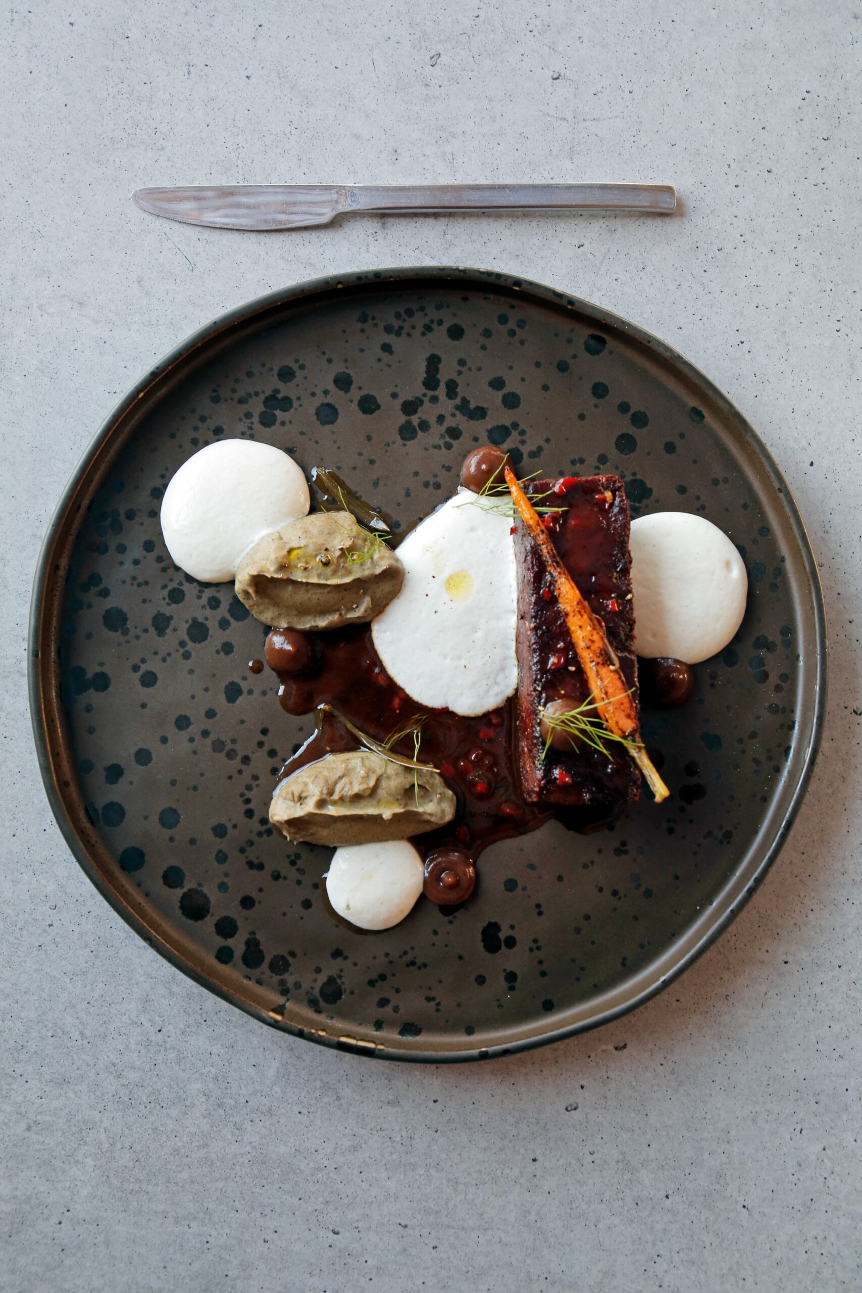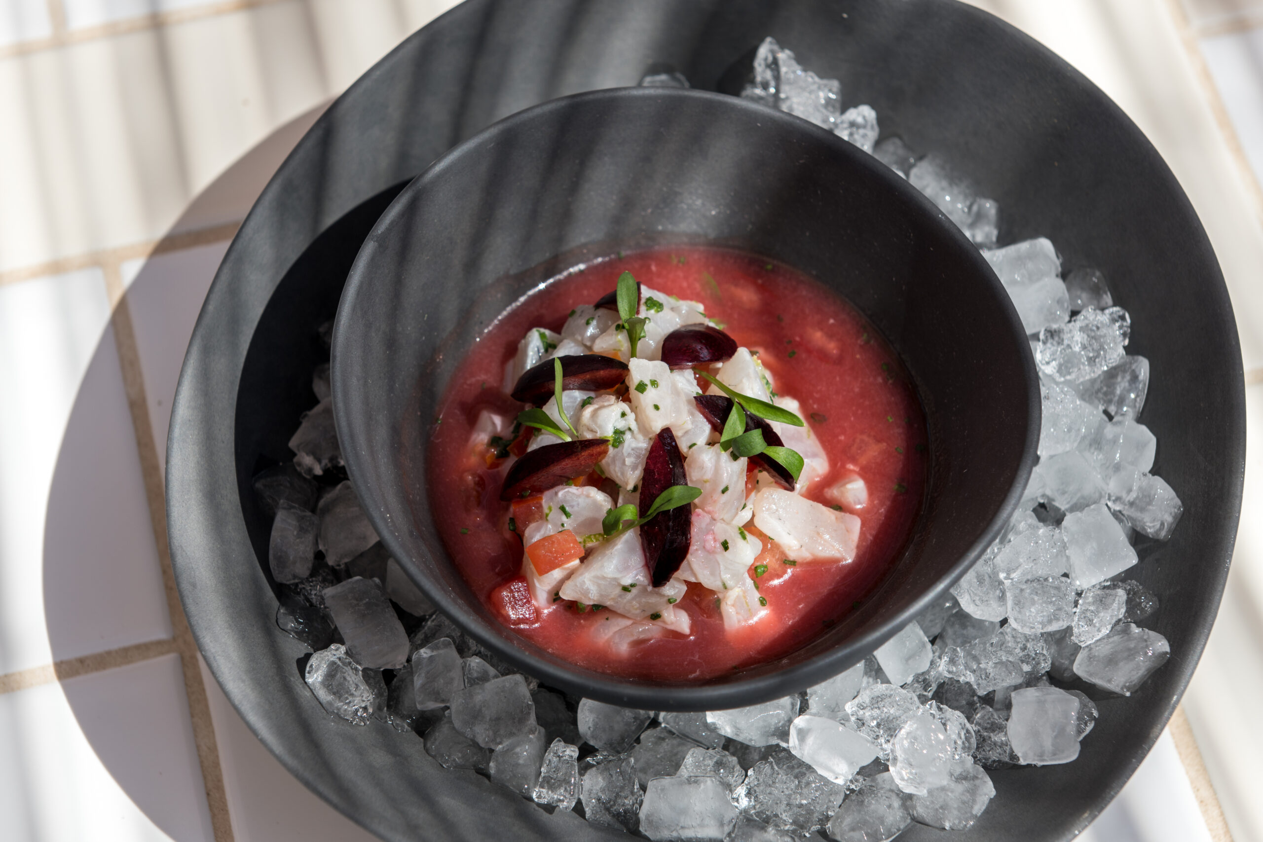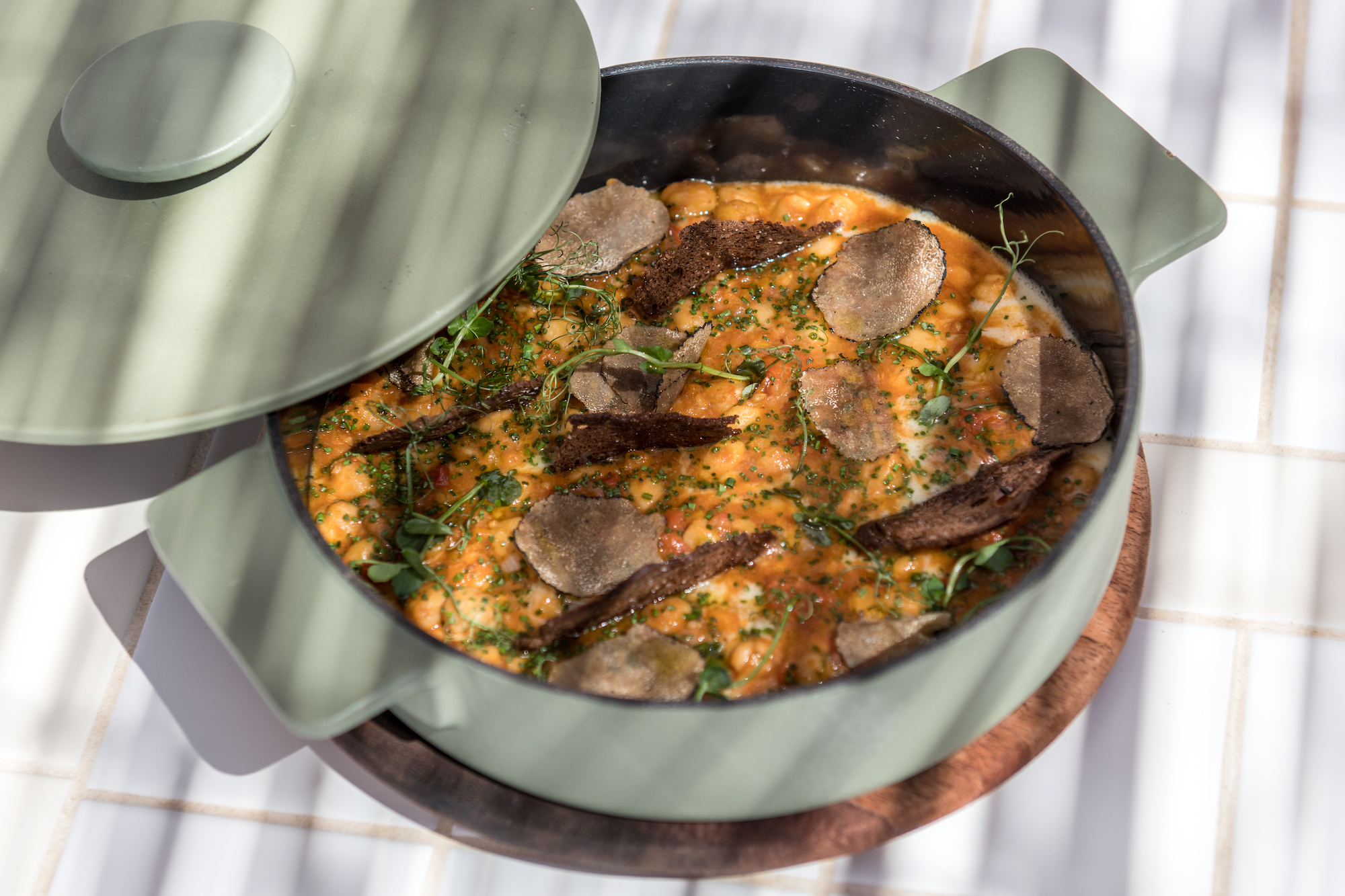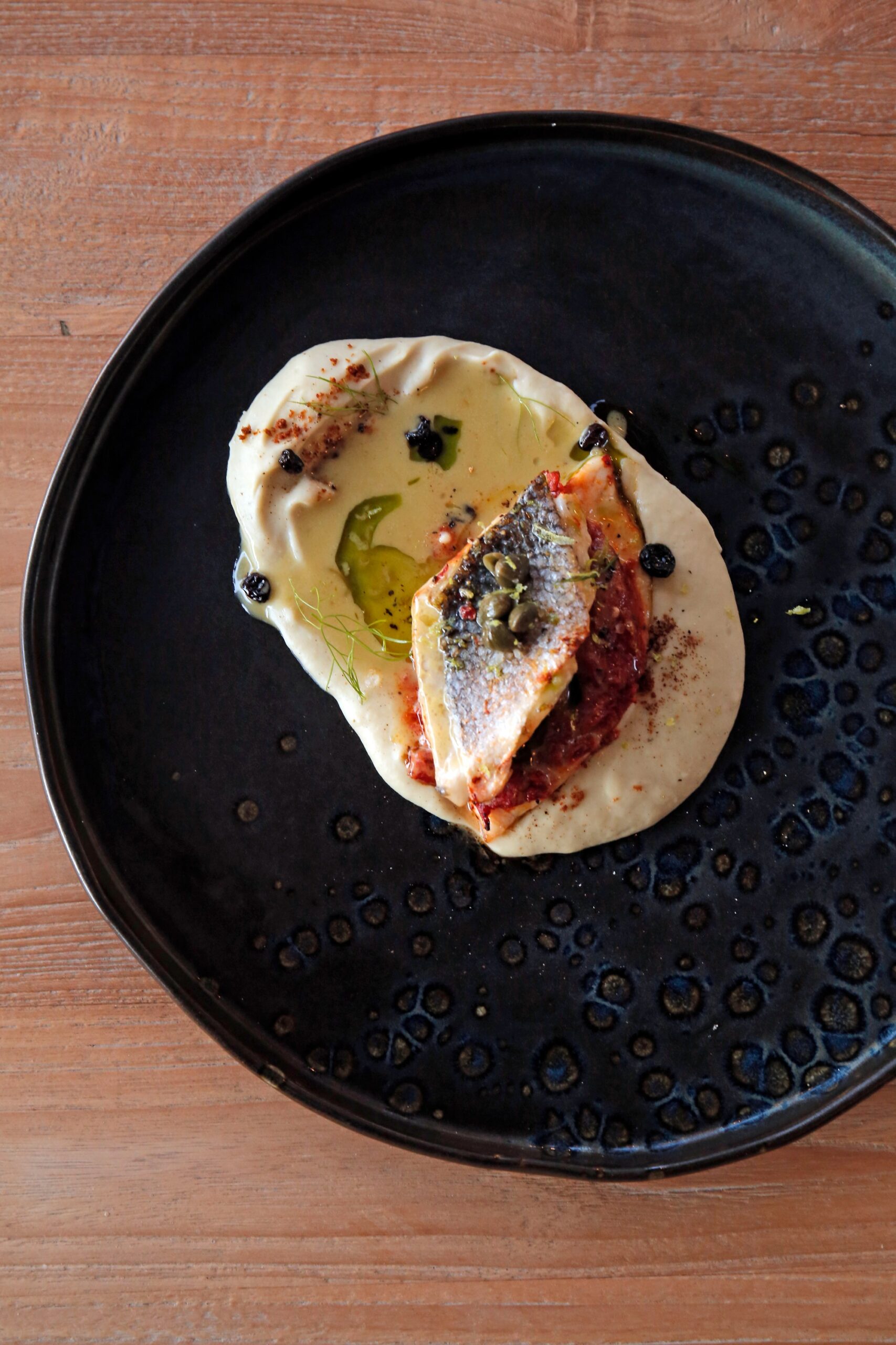 The mouthwatering ‘Parian chickpea with black truffle, crackers, and truffle-flavored cream’ is a must-try. For raw dishes, the sea bream ceviche salatouri with leche de tigre and coriander makes an excellent choice.