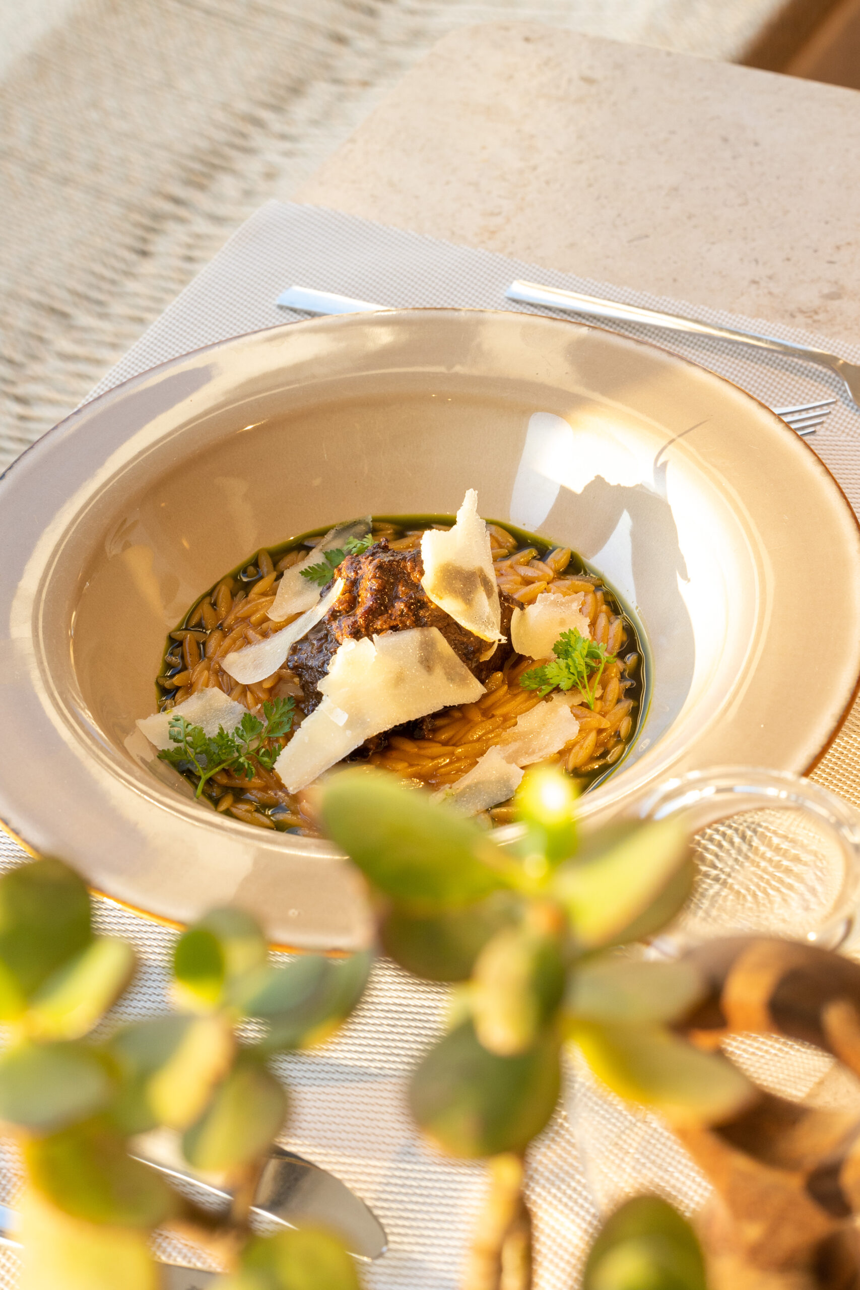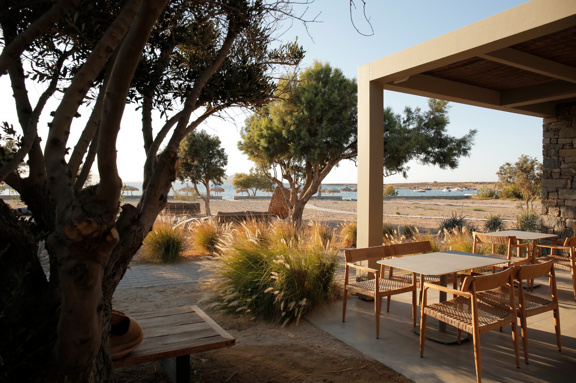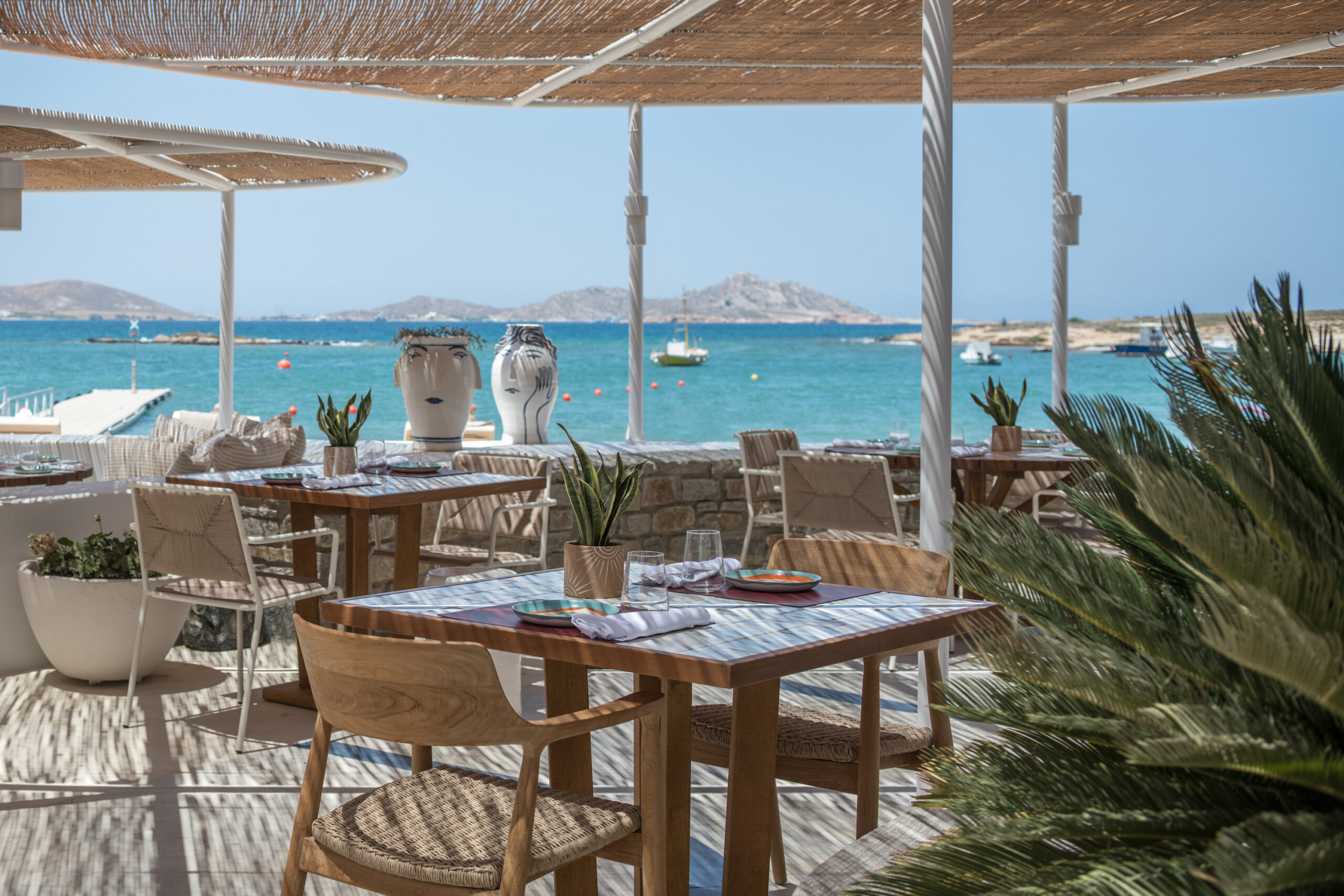 The restaurant with its built-in sofas, comfy cushions and large bar spreads out beneath the semi-covered thatched roof. Its aesthetic follows the charming aesthetic of the boutique resort Cove Paros that hosts it. Clean simple lines, stone, concrete in earthy colours, in perfect harmony with the Cycladic landscape – as if emerging from the earth. The preservation of natural vegetation, low shrubs that withstand the melt, tamarisk reeds, elms, give an almost touching innocence to the space.