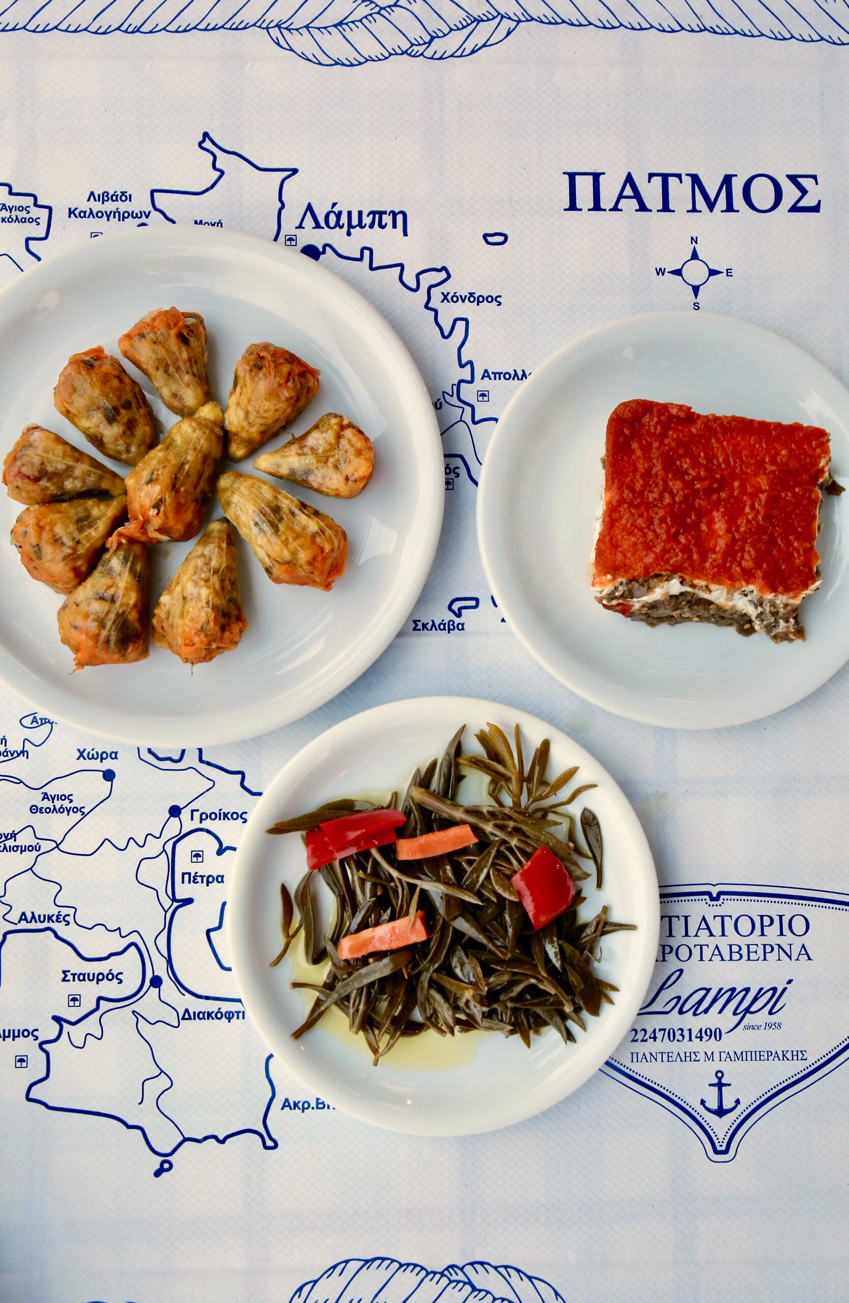 At the western edge of Skala, you’ll find a classic fish tavern – ouzeri, where you can enjoy your ouzo with mezze. Isidoros Kamitsis proudly shows us the fresh fish of the day that they have fished, while his father, Nikos Kamitsis, checks the coal before the first guests arrive. They don’t take reservations. The simplicity of the food with wild greens, vegetables and daily fish, homemade taramosalata prepared by Maria, Isidoros’ mother, “the boss” as they call her, is just excellent.