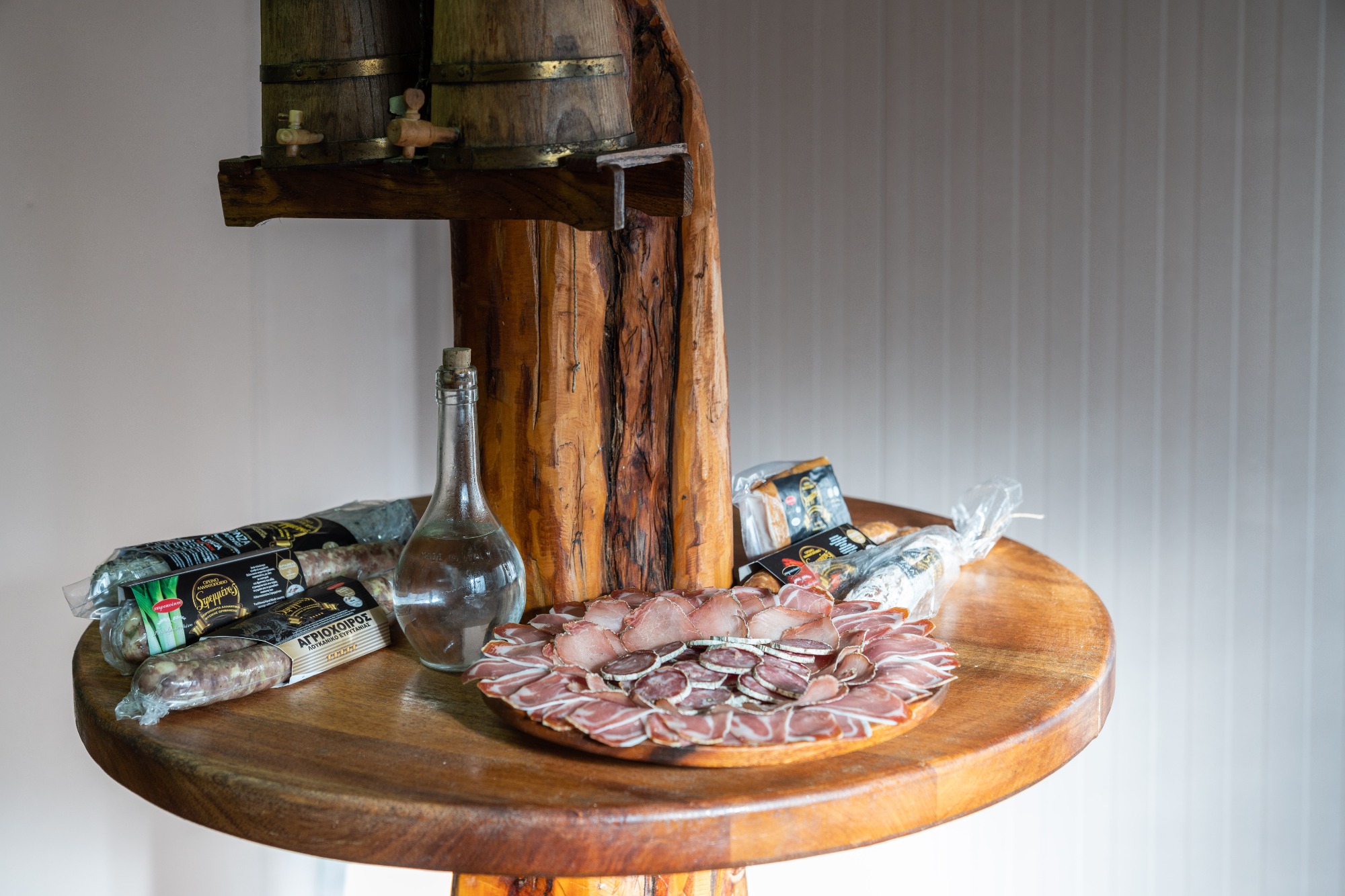 “Akrokolion” (proscuitto), lonza, traditional salami, spicy salami (with smoked paprika from Aridea), the black pork salami, sausage with leek (local traditional product of Evrytania), sausage with smoked paprika from Aridea, smoked bacon (whole pancetta smoked with beech wood), black bacon, variety of cold cuts.