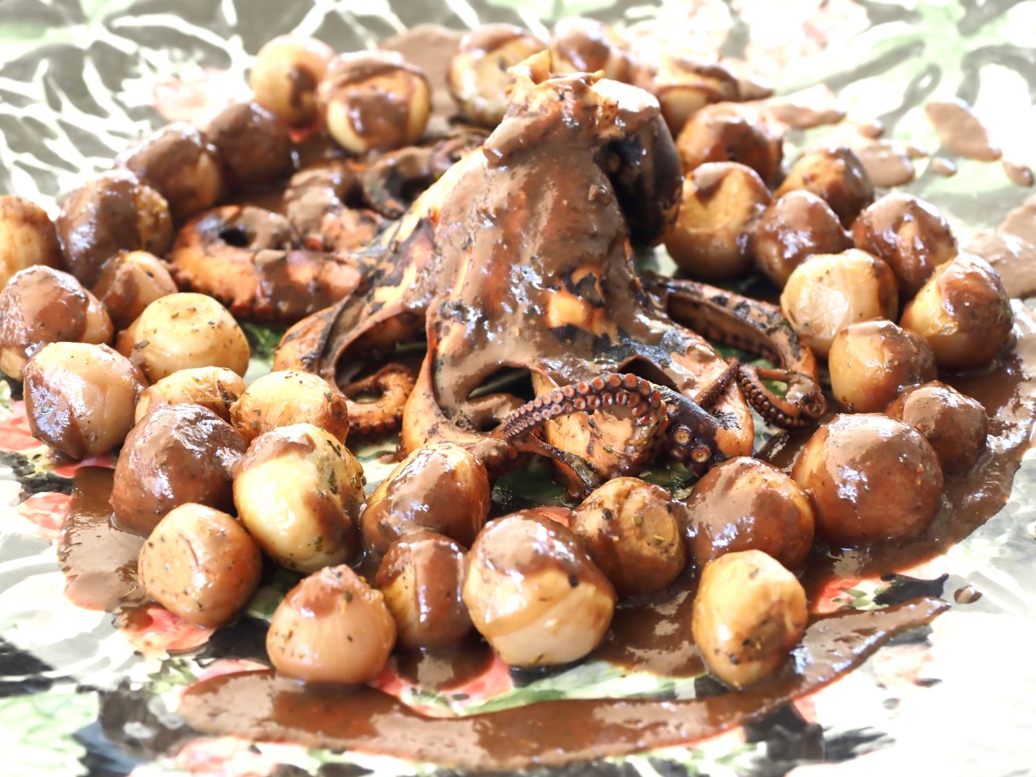 If wild garlic can be said to carry the earthy signature of the land, then octopus surely holds that of the sea. That very flavour comes alive in its independent preparation. Left whole in a pot, with a touch of olive oil, it faces the relentless heat. It simmers in its own juices, seasoned generously with oregano, crushed peppercorns, dried coriander, turmeric, and a couple of bay leaves. A splash of vinegar and a good deal of patience follow. The natural liquids of the freshly-caught octopus are enough to tenderise it and to create a rich sauce.