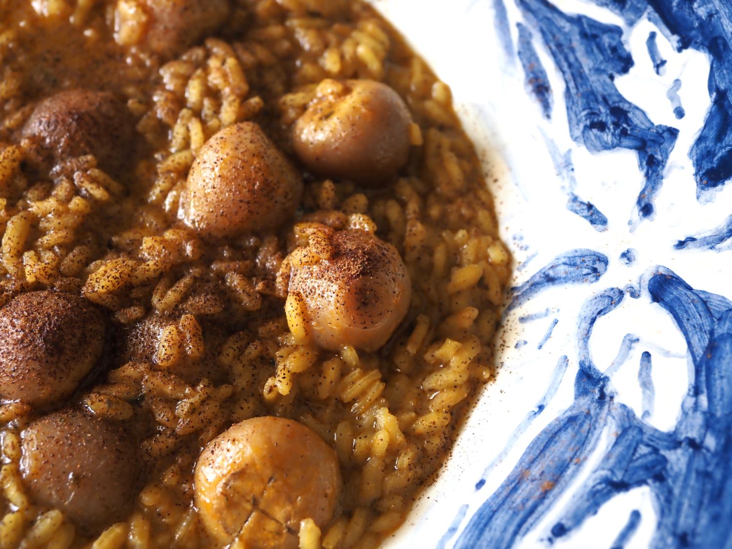 In a deep frying pan, garlic is sizzled in olive oil, seasoned with curry, turmeric, freshly ground pepper, sweet paprika, and oregano. Once they had taken on a rosy hue, they were set aside, making room in the pan for the specialist risotto rice. The heat at the base was quenched with apple vinegar, before the ritual began of ladling in the broth, one spoon at a time, stirring constantly. Each new ladle was added only once the preceding liquid had been absorbed. As we neared the dish’s completion, the garlic cloves were reintroduced to the risotto, joined by a generous spoonful of Cretan ‘staka‘ from Pantelis Kouvarakis’ dairy, located in Hamezi, in the land of Sitia. Upon serving, memories of a wedding feast on the island stirred, and the risotto was dusted with ground cinnamon, an evocative hint of grand, exotic voyages across the world’s oceans.