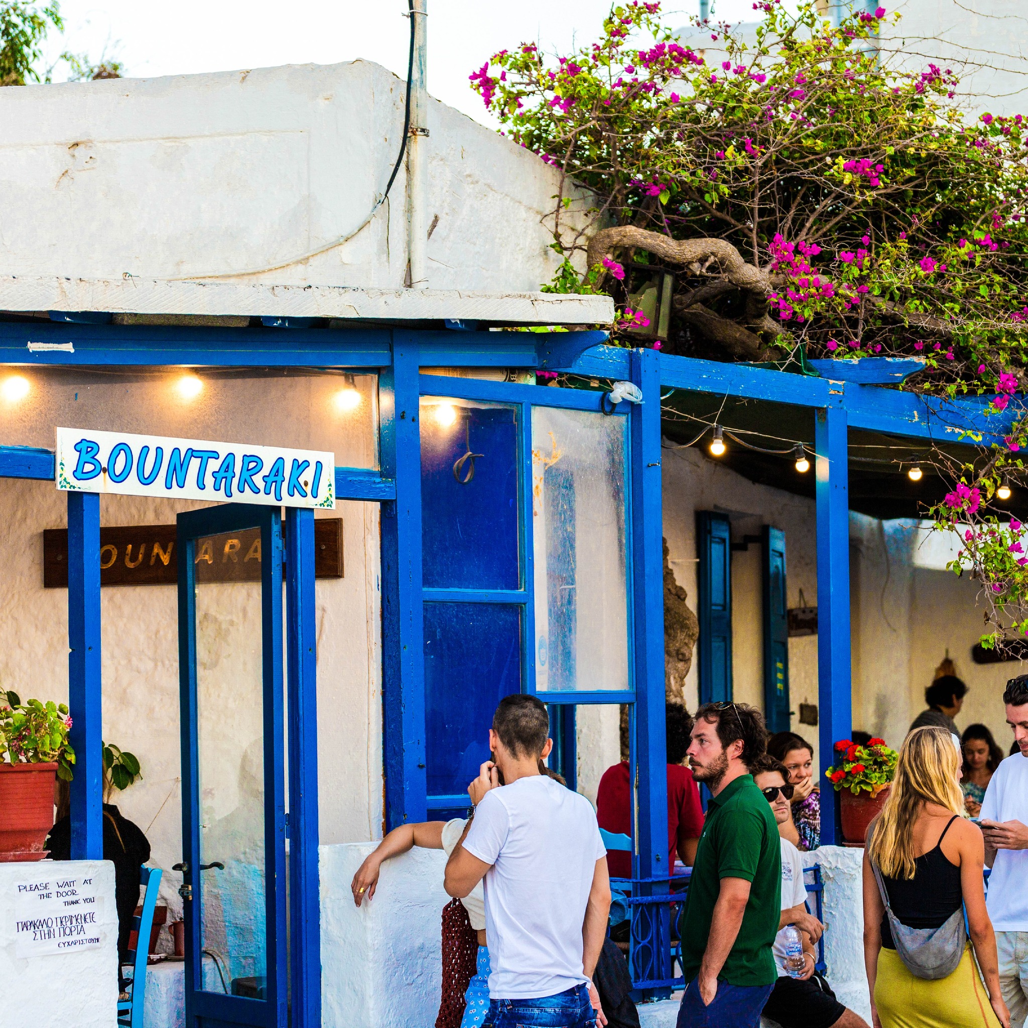 Located on the beach in Parikia’s sheltered bay, Cabana Bar is a laid-back spot where the day stretches between morning swims and relaxed evening dinners under exotic palm trees. With friendly service and an enticing range of food and drink options, it attracts a diverse crowd, from casual visitors to those staying for the day. Known for its vibrant beach club atmosphere, this place becomes lively at sunset, offering a more energetic alternative to the nearby quieter tavernas.