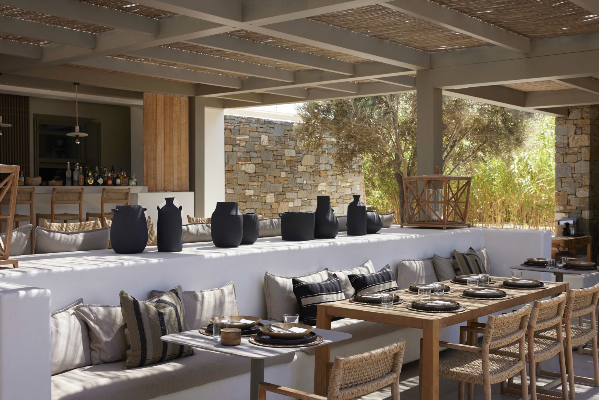Acclaimed Greek chef Yiannis Kiorohlou offers a “Medite-Grecian” menu inspired by his experience at Michelin-starred restaurants such as La Guerite and La Petite Maison in Cannes. The restaurant, part of the Cosme Paros Hotel, takes its name from traditional Parian stone ovens, echoing its connection to local culinary traditions. Situated between the pool and the beach, the restaurant has stunning views of Naousa Bay, transforming as the sun sets and nearby towns light up the water.