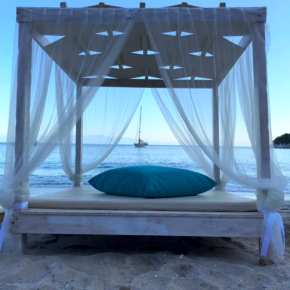 Glysteri Beach Bar is a newly opened bar located on the gorgeous beach of Glysteri, close to Skopelos Town. The owners created an “especially ecological construction” to ensure it blends perfectly with the authentic beauty of the landscape. They used materials from all over the island, such as natural woods and woods from old boat constructions, bricks made of earth, rocks from Mount Pelion, pebbles from the sea, old trunks, and dry leaves from palm trees for umbrellas.