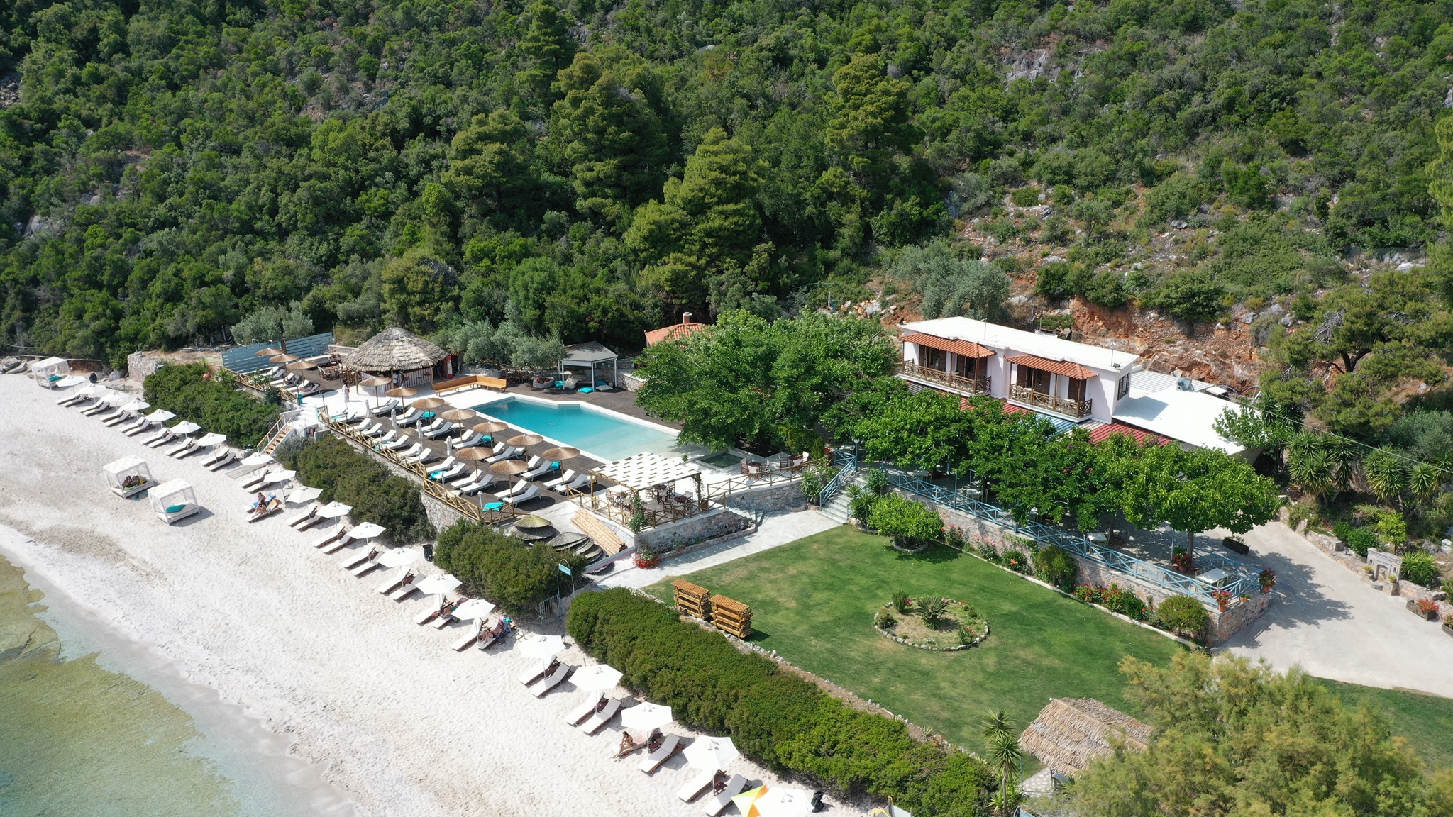 Apanemo Restaurant & Beach Bar is located on Limnonari beach, with enchanting views of the emerald sea and cooling shade of pines. It’s the perfect place for the ultimate Greek island experience, offering a complete vacation proposal from morning to night. Relaxation, service, sun, sea and a great location, what more could you ask for.