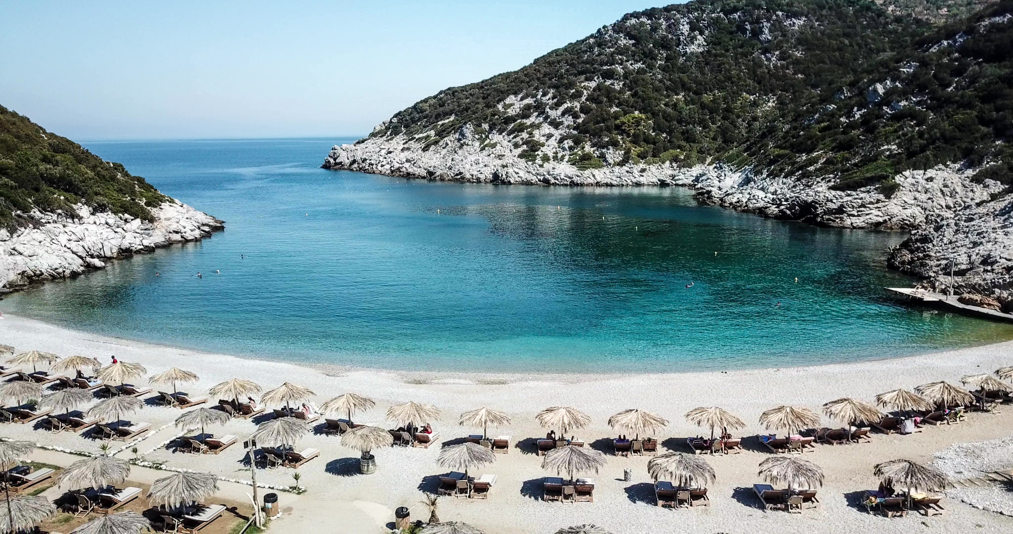 Kastani Beach Bar is located on one of the loveliest beaches in Skopelos, surrounded by pine trees that reach the edge of the shore. The beach is known for its diaphanous depths and creamy white sand, and it became famous worldwide after being featured in the movie “Mamma Mia.” Kastani Beach Bar is a great place to relax and soak up the sea and scenery.