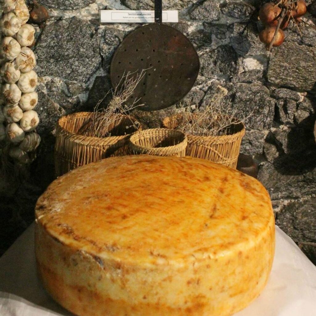 Graviera Naxou is a hard table cheese with a refreshing taste and light aroma, a thin natural rind, pale yellow interior and compact structure with small, regular holes. TasteAtlas notes the cheese’s composition of “maximum moisture of 38 percent” and “at least 40 percent fat in dry matter,” which give the cheese its satisfying richness. It even credits the island’s terrain, explaining that the milk comes from animals grazing freely among Naxos’ wild herbs, shaping a flavor tied directly to the landscape.