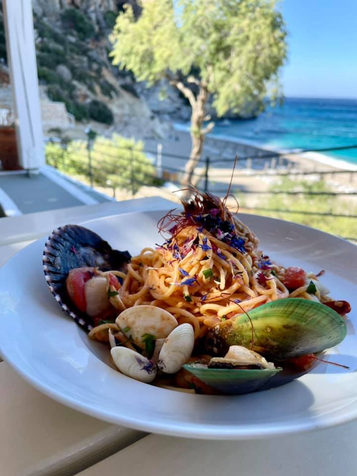 A terrace with a beautiful sea view, located close to Apella. An excellent choice for those who want to combine their walk with a swim at Kyra Panagia and then enjoy a meal at one of the best restaurants in the area. All dishes are made with local products, while the appetizers are unique and delicious. Choose eggplant rolls with local cheese as a starter, and of course, the excellent pasta for which Kelaria is famous.