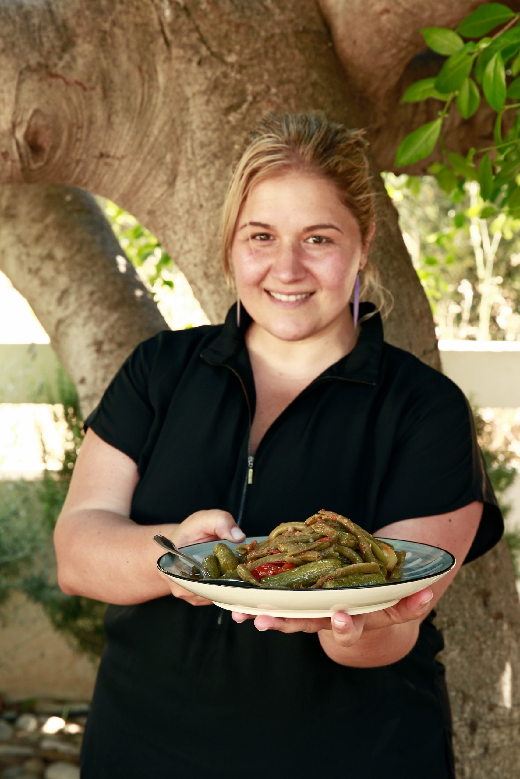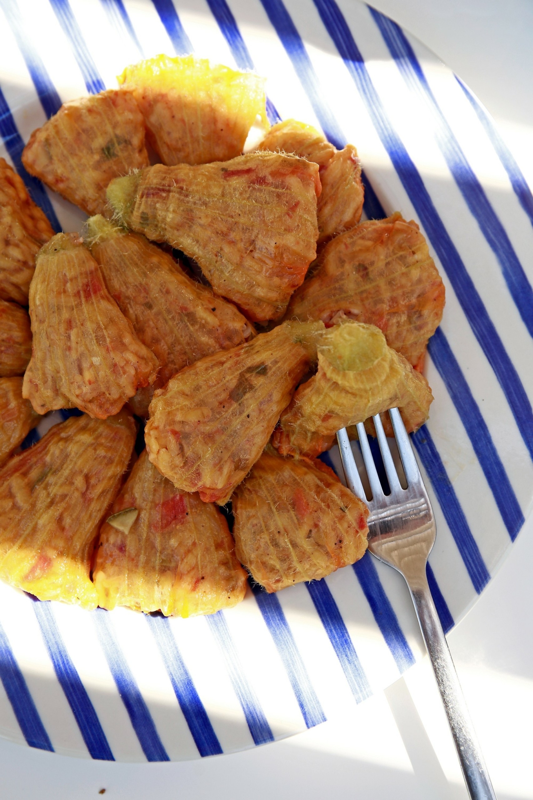 The area is Mikro Livadi and it’s around 150 metres inland from the beach of Episkopi. Malamatenia Tzimpoukakis, neé Kaloterakis, the cook and hostess, spreads her arms and shows us around, explaining how they grow watermelons, melons and also pistachios. The ground is so fertile that nothing can stop growing once it’s been planted.