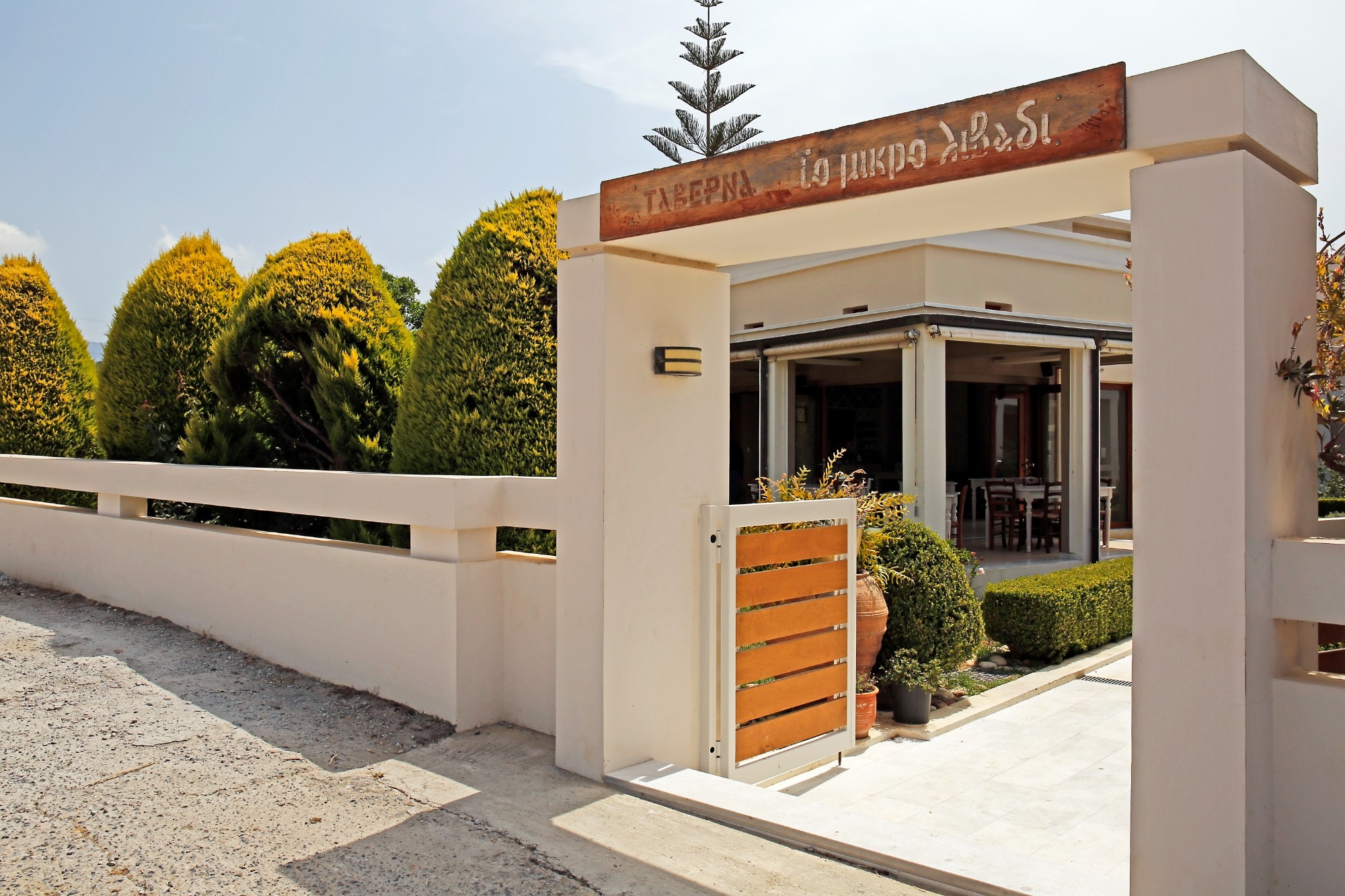 At “Mikro Livadi” the variety available makes choosing difficult. Omelette withblack bryonies and asparagus, courgette flowers both plain and stuffed with cheese, a selection of fish and meat dishes, and also a one-of-a-kind moussaka, with saffron, so smooth it feels like baby food.