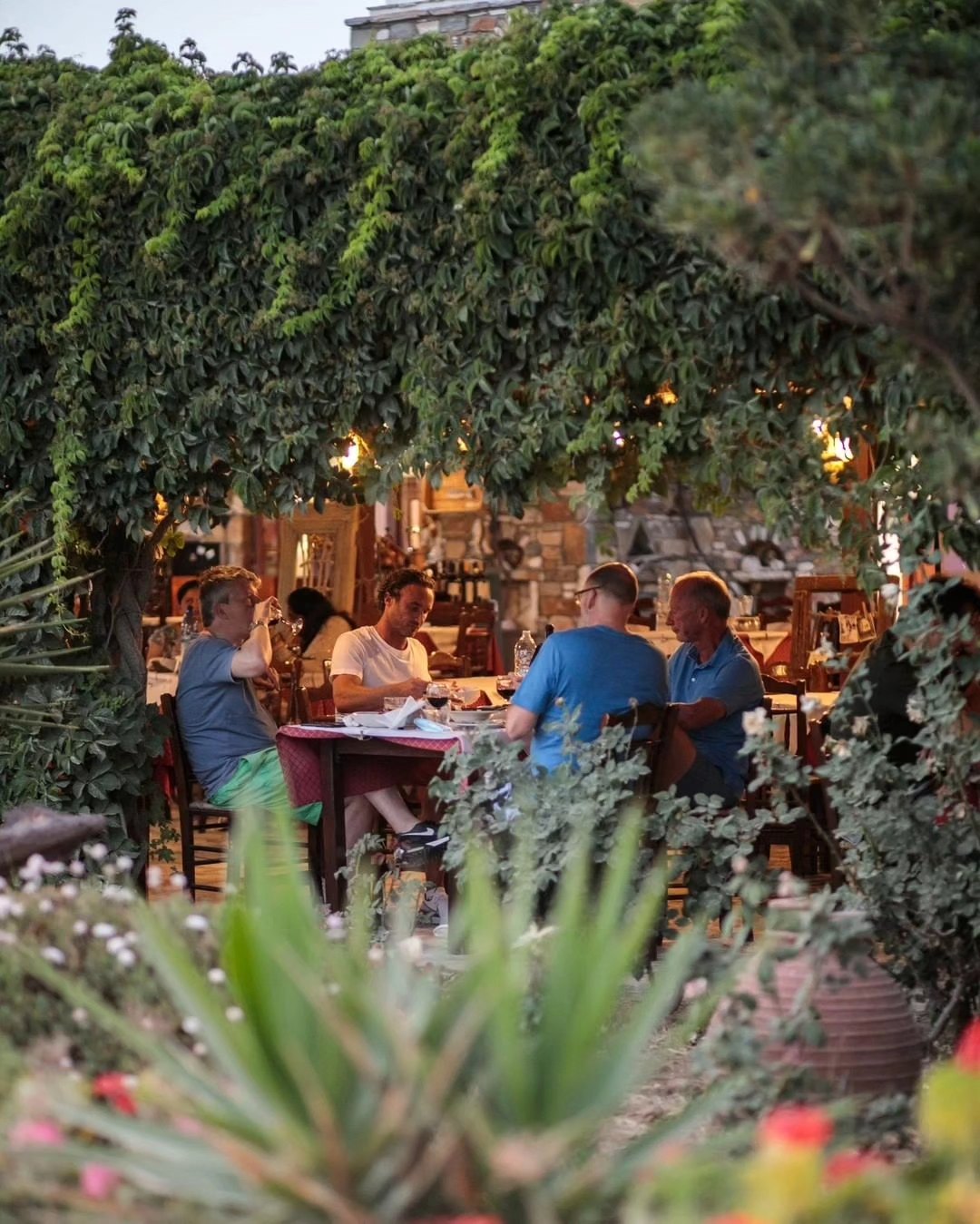 About 20 minutes from Chora, Axiotissa is one of the island’s best-known tavernas, with a leafy courtyard and a kitchen that has stayed loyal to local cooking. Many of the ingredients come from its own farm, and the menu moves through dishes such as slow-cooked lamb with garlic and kefalotyri, rooster in tomato sauce with linguine, fried potatoes, and seafood handled with a light touch. It is a place people return to for the setting, the ingredients, and the feeling that nothing is being overdone.