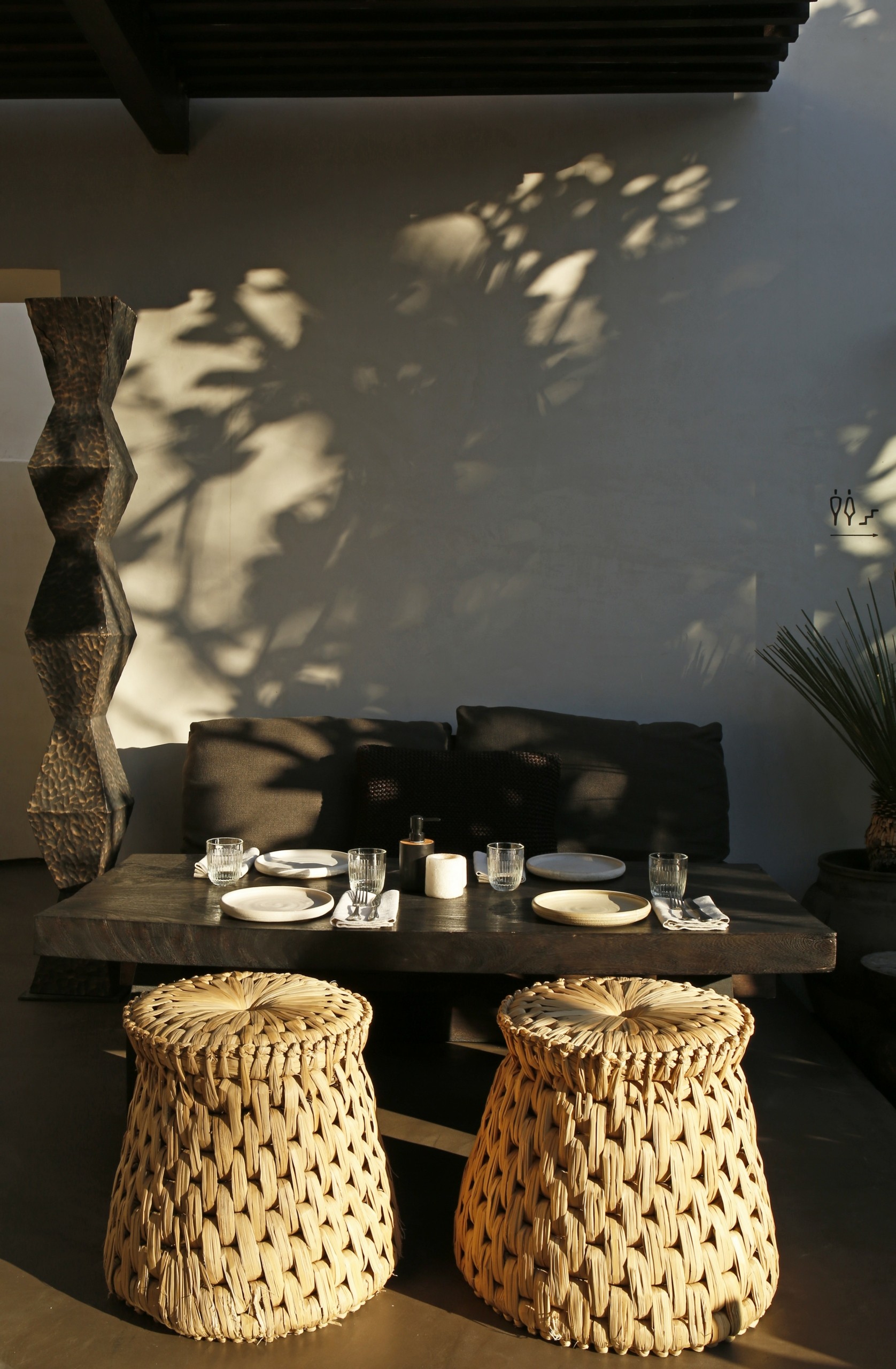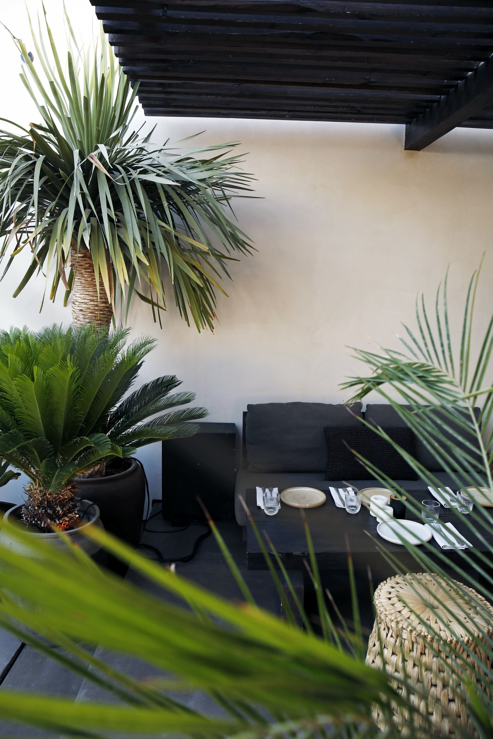 The space has been tastefully created, offering a warm, welcoming environment. Heavy, wooden tables are neatly arranged among the trunks of the imposing trees. The long bar, on one side of the courtyard, adorned with cacti and warm lighting, is inspired by some exotic side of the Mediterranean.