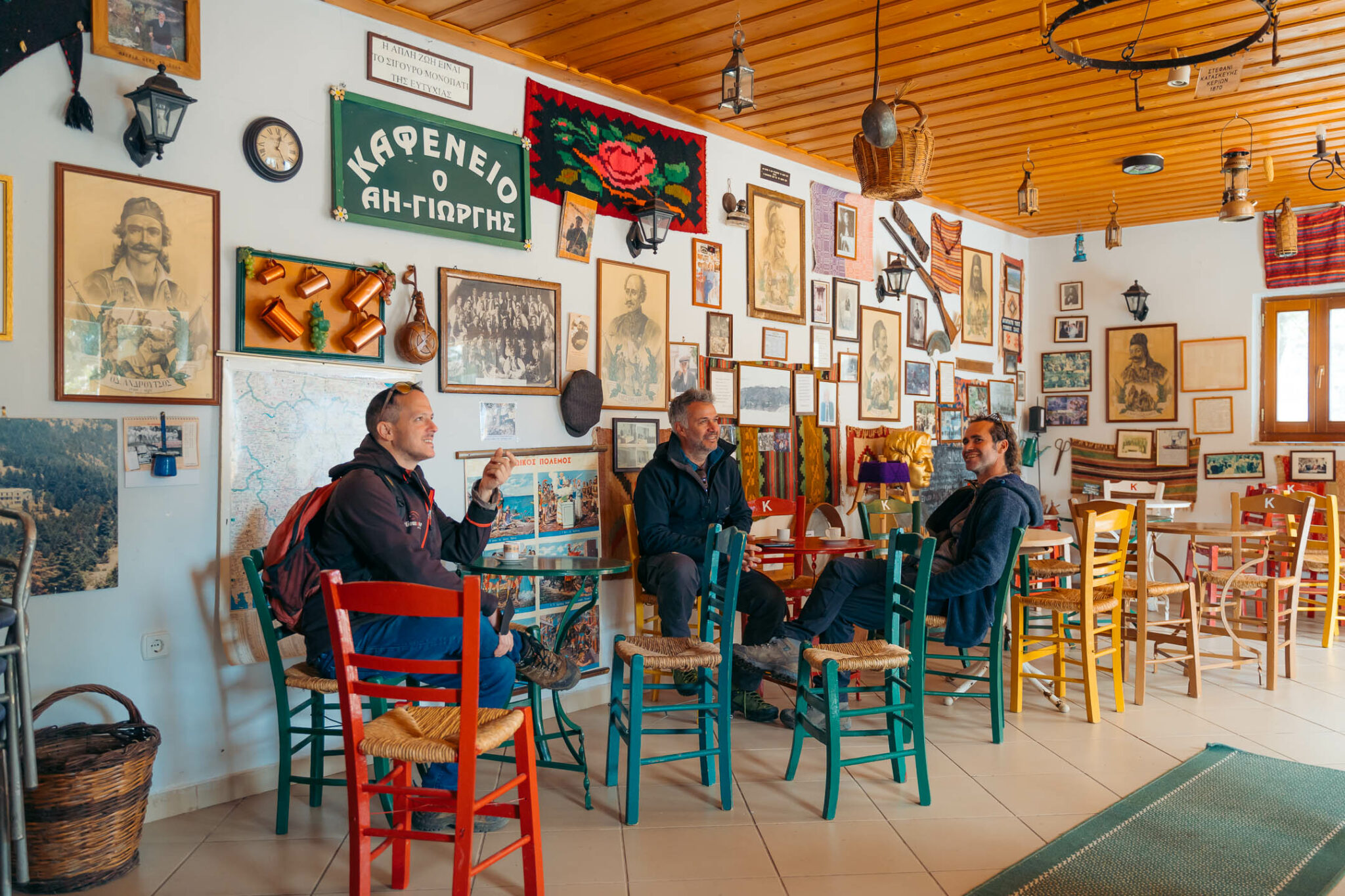 We have been in the village for some time and we have not seen a human being, only a dog that keeps us company. As we prepare for the hike, Lambros leads us to the café right next to the church. It is a different café though, as it is a self-managed. There is no barista, and anyone who wants a coffee takes on that role. “Anyone can come here and make their own coffee, using the supplies and utensils on site. Their only obligation is to leave it as they found it, clean and tidy”.