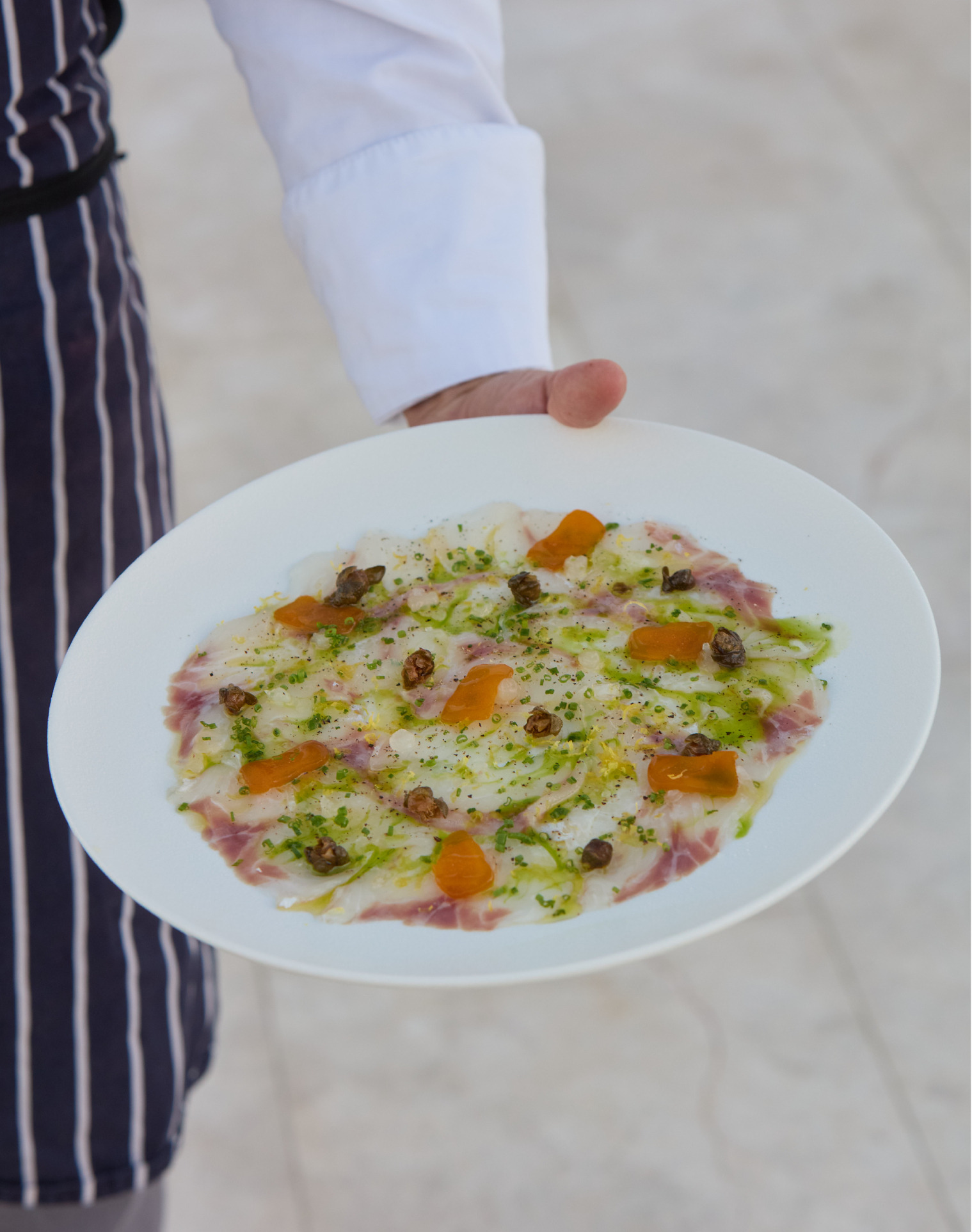 On the western side of Parikia, Crios combines the energy of a beach club with the finesse of a fine restaurant. Under executive chef Hippokratis Anagnostelis, the menu blends Greek summer flavors with cosmopolitan flair: amberjack tartare with sea urchin and wakame, lobster paccheri with feta and ouzo, and crisp fried sardines. The in-house pastry chef completes the experience with playful desserts. With its boho-luxe design, polished service, and sweeping sea views, it is one of Paros’s most stylish seaside dining spots.