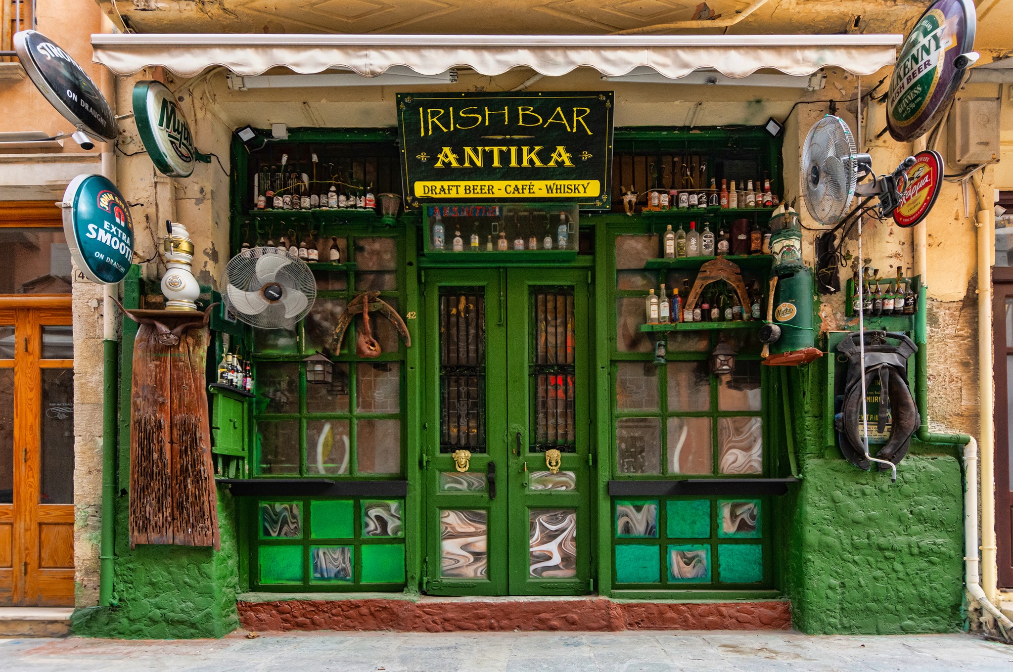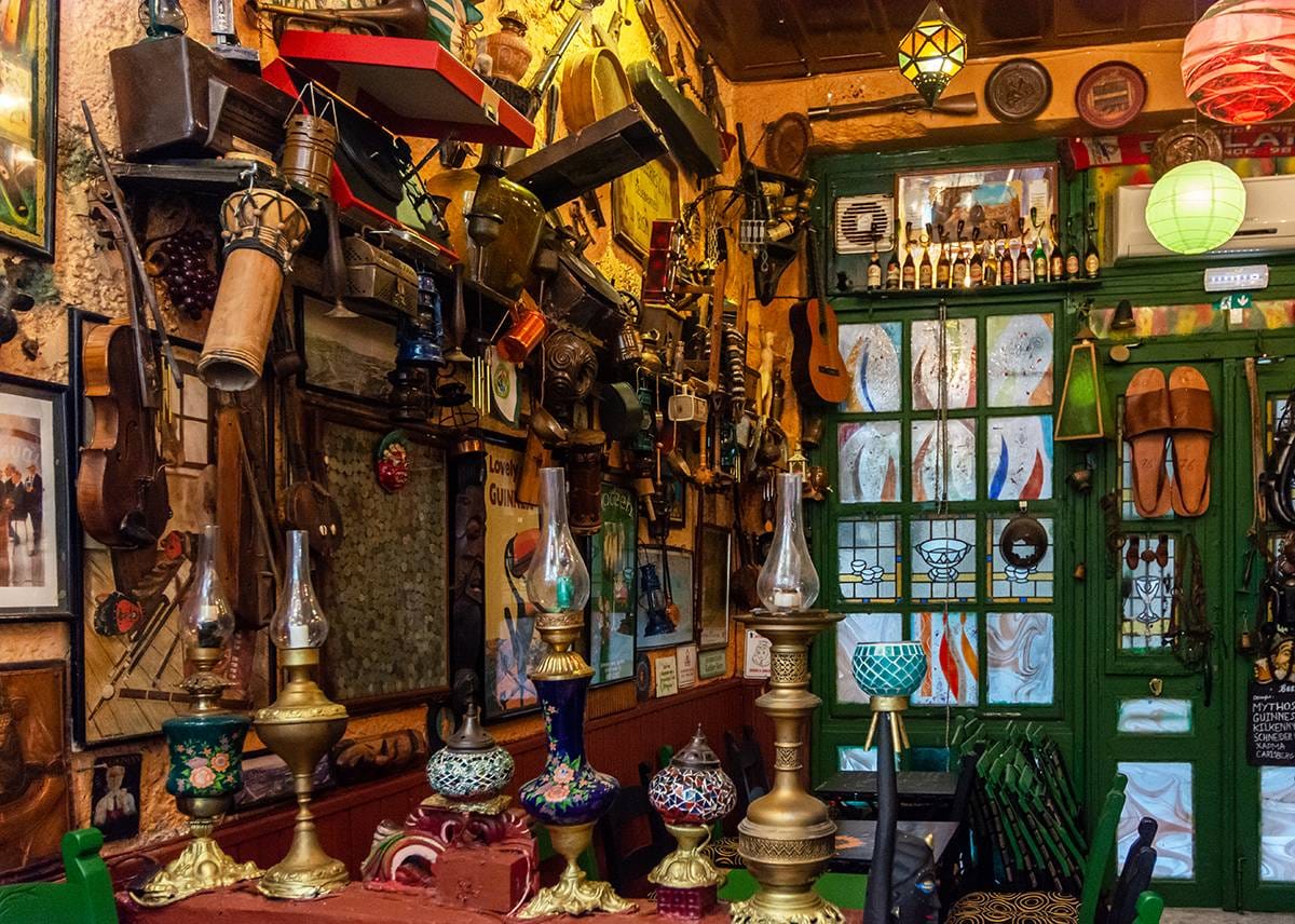 Tucked away on a quiet street in the center of the historic district, Antika Irish Pub, formerly known as The Punch Bowl, is a charming hideaway that you won’t want to miss. The walls and floors of this cozy spot are covered with an impressive collection of Irish memorabilia. You’ll be surrounded by an eclectic mix of treasures, such as antique gramophones and giant leather sandals, once you step inside. While the authentic Irish Guinness is a must-try, the extensive selection of craft beers, including local Cretan brews and premium whiskeys, are also worth exploring. To complete the Irish pub experience, rock and blues music fills the air.
