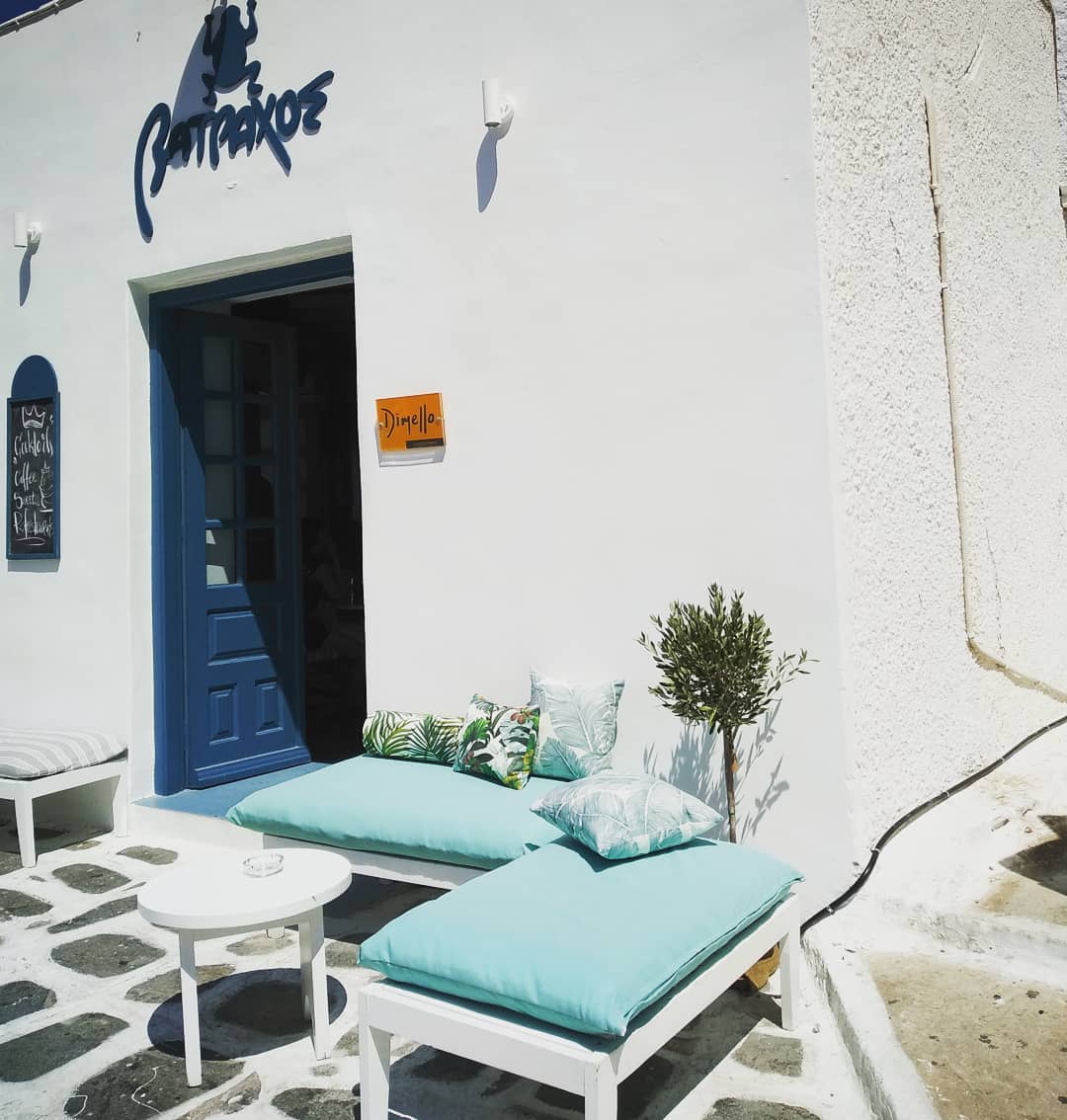 Tucked away in the winding alleyways of Chora, Gaidaros is a delightful bar offering exotic cocktails crowned with coconut, a variety of bottled brews, and mouthwatering snacks. If you’re lucky, you’ll snag a rooftop table but if not join the vibrant gathering extending into the nearby alley. Experience true Greek charm at Le Cotecheri a little corner of the square, where twinkling lights and a snug swing seat create an enchanting atmosphere.