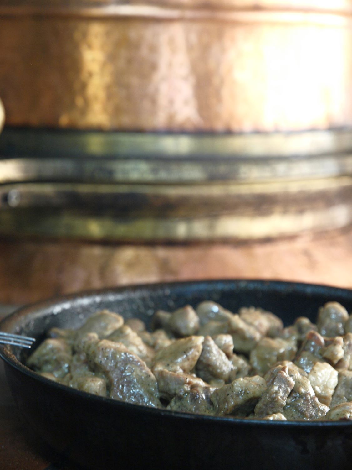Michalis’s pan-fried dish – that is, pork cut into hearty chunks – is first simmered in its own juices, with a judicious addition of water. Once it’s reduced, it’s flavored and spiced with white wine, along with the spices – garlic powder, a touch of pepper, salt – and mustard diluted in wine with a spoonful of flour, creating a delightful sauce in which the food simmers and binds together.