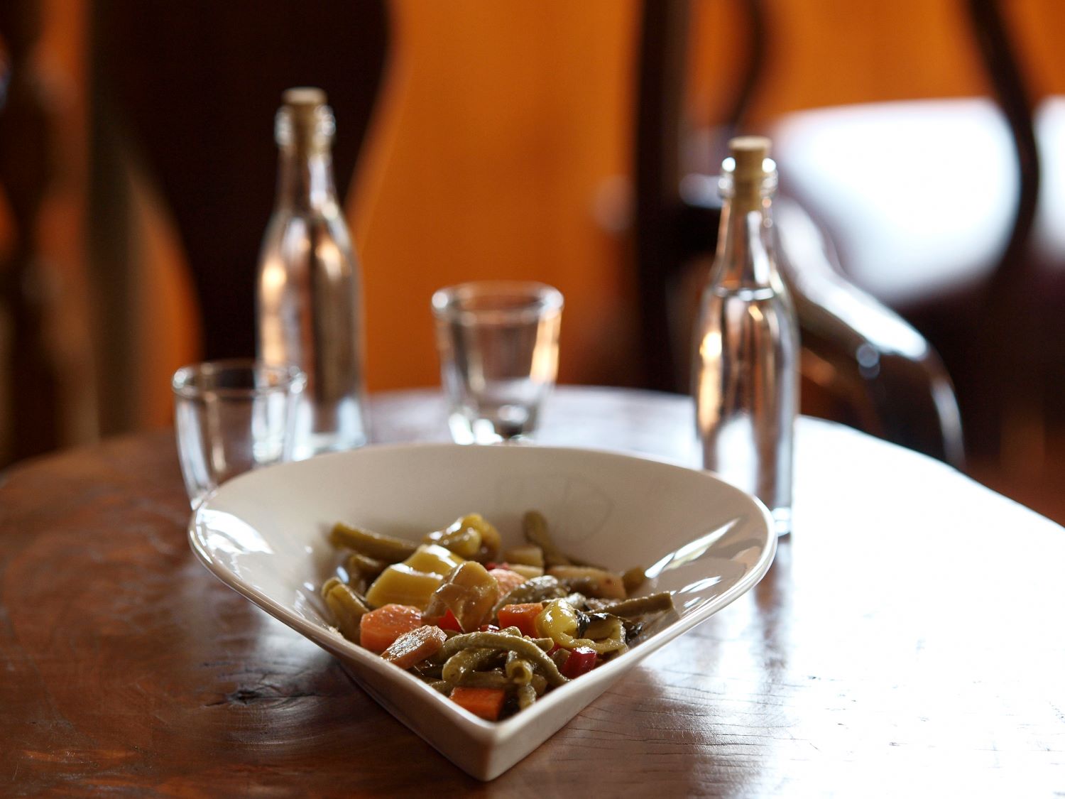 This medley of garden produce, unproccessed and unadulterated, opened a dance of flavors: beans that Katerina herself cultivates in her garden, using seeds she brought from Tinos, carrots, peppers – green, yellow, and red ‘Florinis’ – celery root, tomatoes, and whole cloves of garlic. After blanching the beans, she let them cool in the pot, then mixed them with the remaining vegetables, seasoning them with coarse sea salt, and adding half vinegar and half olive oil. The mixture did not cover the vegetables, instead leaving them open, exposed to the aura of Olympus and the mist of its waters. They simmer for quite some time in the pot on low heat before they start to bubble. She then transfers them to sterilized jars. The liquid mixture barely covers the vegetables, softening them.