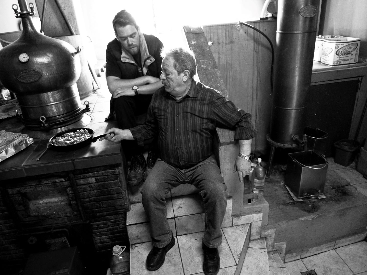 The atmosphere is thick with the scent of tsipouro, traditional food, and good company, a joyous conspiracy of sorts. It’s a song of initiation into the mysteries of camaraderie around the laden table, a ceremonial dance before a still dripping with joy. Here in the north, the distillation process is always double, and the power of tsipouro, whether from grapes or arbutus berries, grappa or sweet anise, is irresistible.