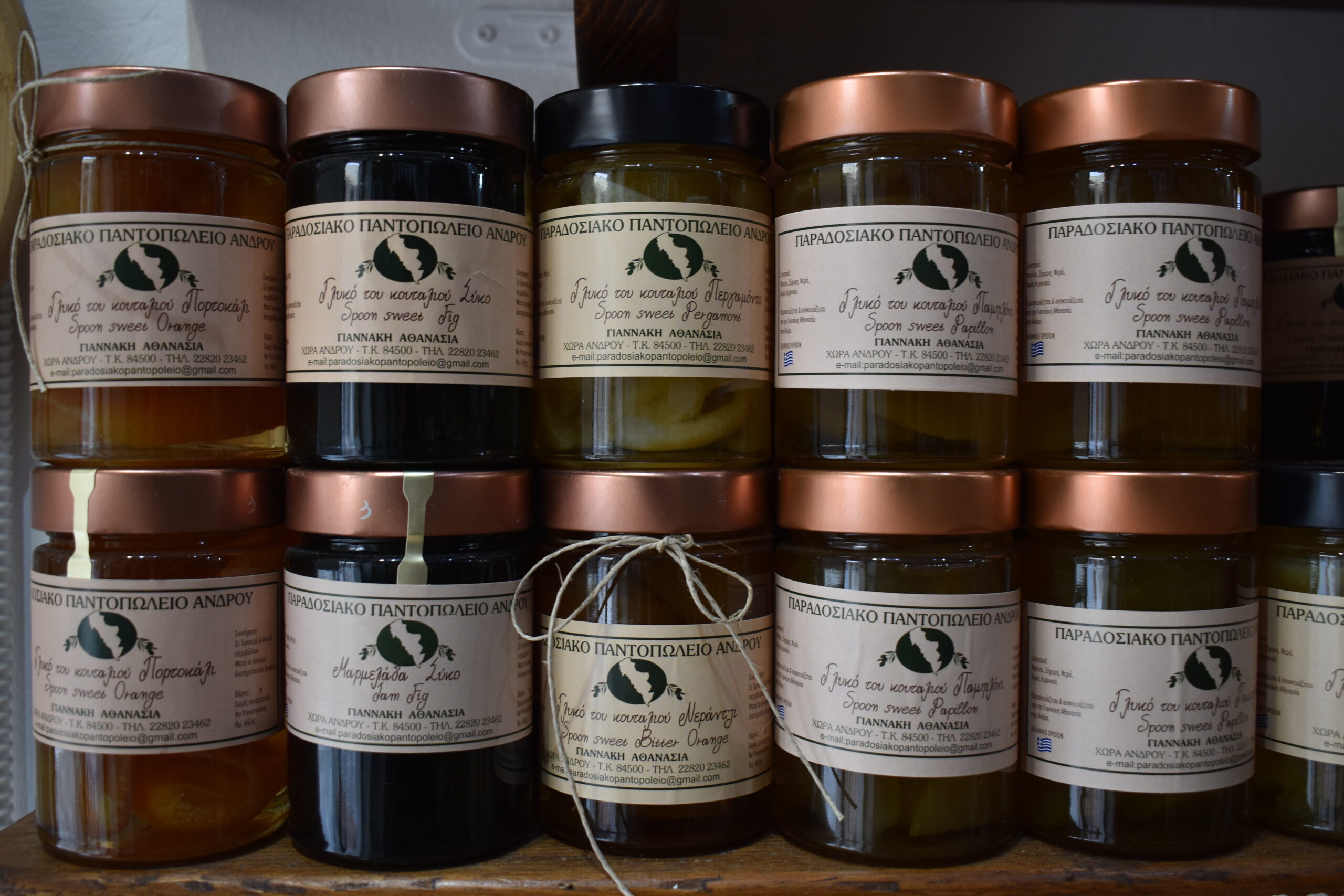 The ‘Paradosiako’ food store brims with a cornucopia of both sweet and savoury delights, all expertly crafted in the humble workshop at the back of this deceptively diminutive establishment. Handmade pasta, dehydrated on-site, sits cheek by jowl with tangy chutneys and tomato sauces, spoon sweets and their jam counterparts, handmade nut butters, lemon-flavoured Turkish delights, and in-house liqueurs flaunting rose, mastic, banana and lemon flavours. The store’s own honey, from their bees in Vóri and Batsí, and irresistibly delicious cinnamon, bergamot or orange cookies – so tantalisingly fragrant you’ll be led by your nose into the shop if you happen to pass by during baking hour – are just a taste of what’s on offer. Let’s not forget their celebrated pastelaries: dried figs stuffed with walnuts, cinnamon, and sesame inside and out, all wrapped in bay leaves for that extra aromatic kick.