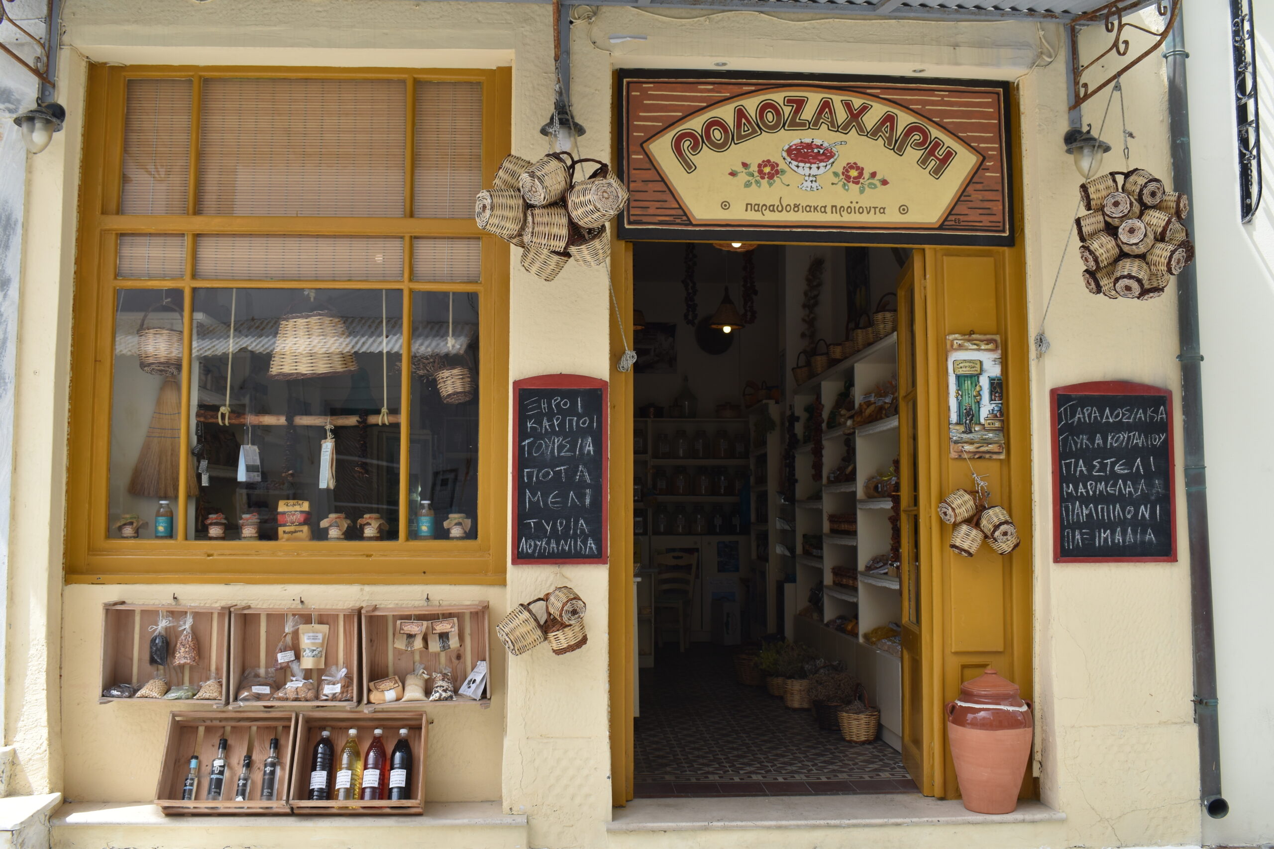 Three stores on the central promenade offer a myriad of local delicacies, from cheese and capers to honey and herbs, and of course, a vast assortment of handmade sweets. At Rodozahari, a name that harks back to the island’s almond sweets, the lady with the gigantic pampilonia in the large black-and-white photograph is none other than the owner’s grandmother, who crafts the spoon sweets and jams you’ll find here. Produced in small batches, as the fruits are sourced from family-owned estates, they are the epitome of homemade sweets. Their pastelia, packaged in little jars, purely made with honey and walnuts, are an incredible healthful snack for all hours.