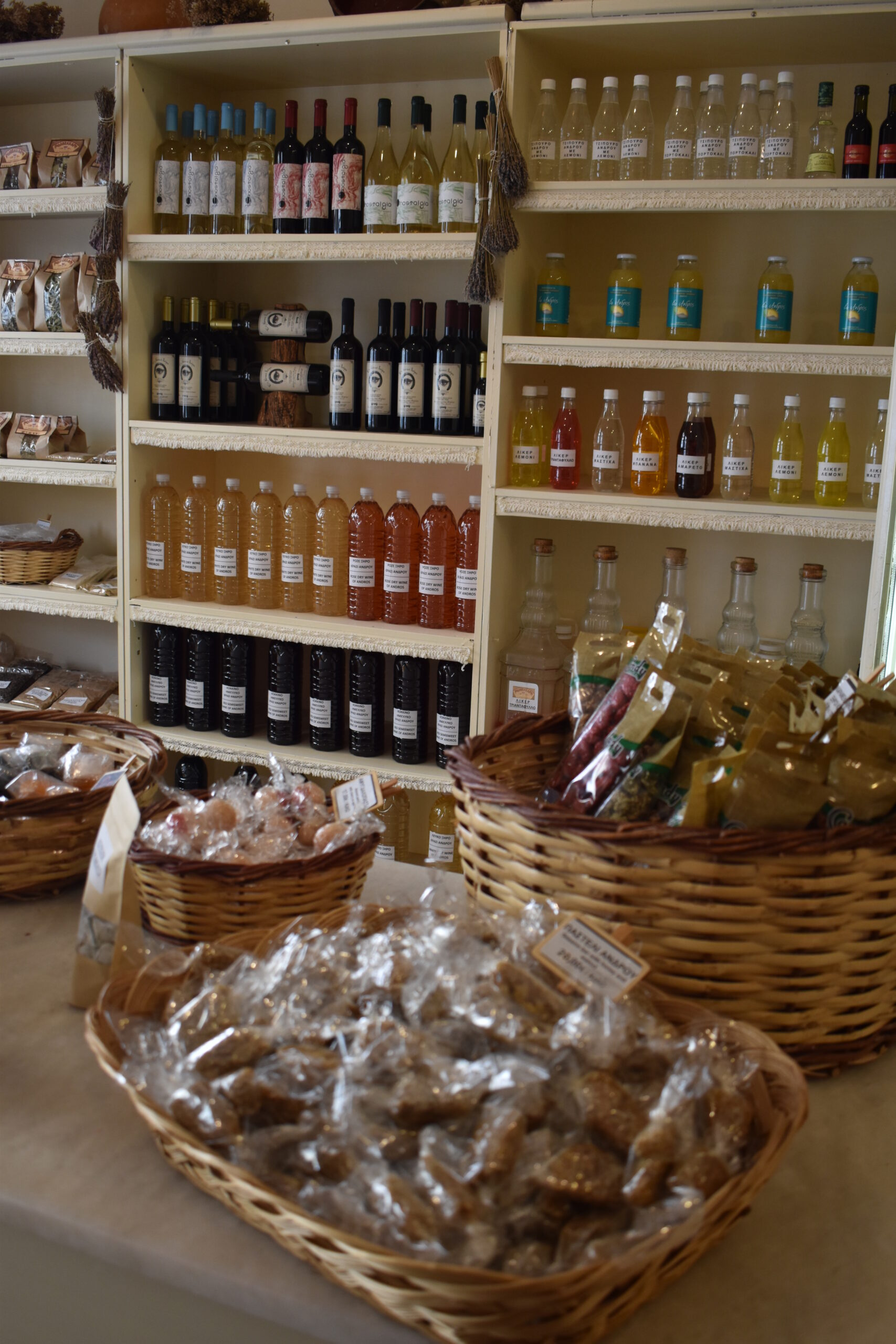 And do make a point to stop by the chic Andros Amorgion, the Andriot branch of the Amorgian chain, a veritable showcase of Cycladic products. The store is practically halved by an impressive array of multiple award-winning drinks from Amorgos, certain to surprise you with their variety and originality. Tsikoudia with saffron, prickly pear tequila, tsipouro, acclaimed ouzo, sundried organic wine, and the new sweet drink “Endless Blue” with raki, herbs grown by the sea, and a striking natural blue colour derived from blue algae. The delectable offerings from Andros include exceptional honeys – thyme, heather, alder – and beeswax, handmade pure spoon sweets and jams from the Batsi Women’s Cooperative, concentrated lemonades with or without sugar from the region’s exceptionally aromatic lemons, Androps tsipouro or ouzo, and organic wines from the island’s two wineries. Among the Cycladic and native varieties, it’s well worth trying the red Mavrotragano and white Potamisi from Kourtesis Winery, and the dry rosé Koumari from the Mastori family.