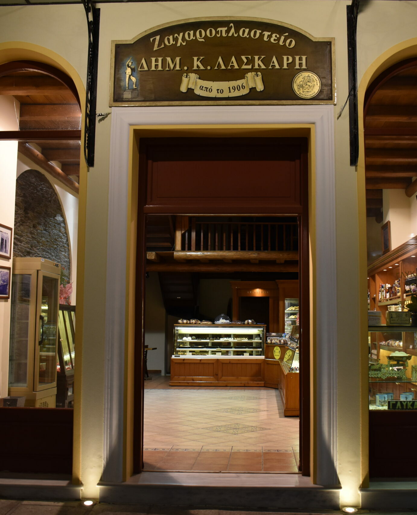 Here, you’ll find the freshest pastitsakia—fluffy round almond sweets with meringue, ground almonds, and bitter almonds that leave an exquisite aromatic aftertaste. You’ll also find classic almond sweets, sprinkled with orange blossom water and wrapped in a sweet cloud of icing sugar, and kaltsoúnia rich in local walnuts and honey. The ‘pampilóni’—those large Andros citrus fruits that bear an uncanny resemblance to quinces—are sourced from local producers to craft a spoon-sweet treat that’s so fragrant, you’ll find it hard to get enough. Load up your supplies in handy metal tins, wrapped in charmingly old-fashioned papers, but before you depart, cast your eyes to the modestly displayed frame above the display cases. It features the gold award that Laskaris Sweet Shop won at the 1935 Thessaloniki International Fair for their exceptional sweets.