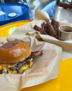 Here, the chef has created a menu that revolves around their signature smoking station, where every kind of meat – whether it’s brisket, ribs, or burgers – is smoked to perfection. The Holy Cow burger is a standout, featuring a smoked beef patty made from Serres beef, topped with caramelized onions, cheddar, a rich cheese fondue, and house-made BBQ sauce, all served on a buttery brioche bun. The smoked beef patty retains a pink hue, a signature characteristic of the smoking process, not its doneness, ensuring a juicy and tender bite. This burger, like all the offerings at Po’ Boys, comes with a side of perfectly crisp, golden fries that complement the richness of the burger. With its focus on slow-smoked meats and Southern BBQ traditions, this place delivers a hearty, flavor-packed experience in a laid-back setting.