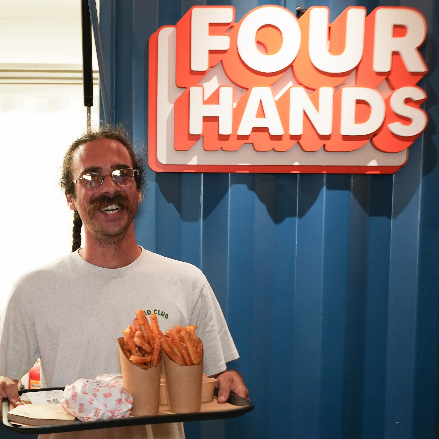 Four Hands has quickly become one of the city’s hottest burger destinations, created by chefs Giorgos Papazacharias and Thanos Feskos. Their take on the smash burger is elevated with fine dining precision: juicy Black Angus patties seared to perfection, layered with caramelized onions, pancetta, melted cheese, pickles, fermented mustard, and their signature “Dripping Knowledge” sauce. The buns are crafted from potato brioche, fluffy yet sturdy enough to hold the rich fillings. A standout side are the churros-style fries, crisp golden potato sticks served with an array of house sauces, while dessert lovers can indulge in sweet churros with chocolate or salted caramel.