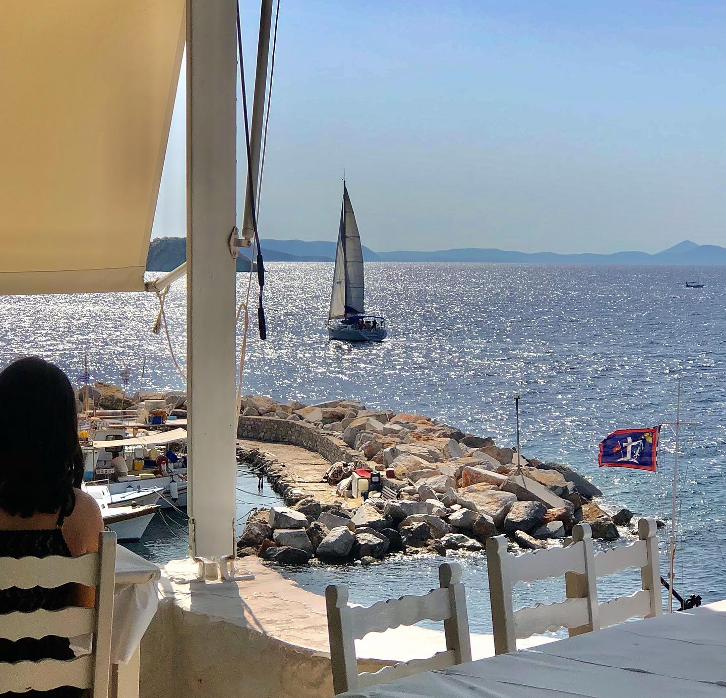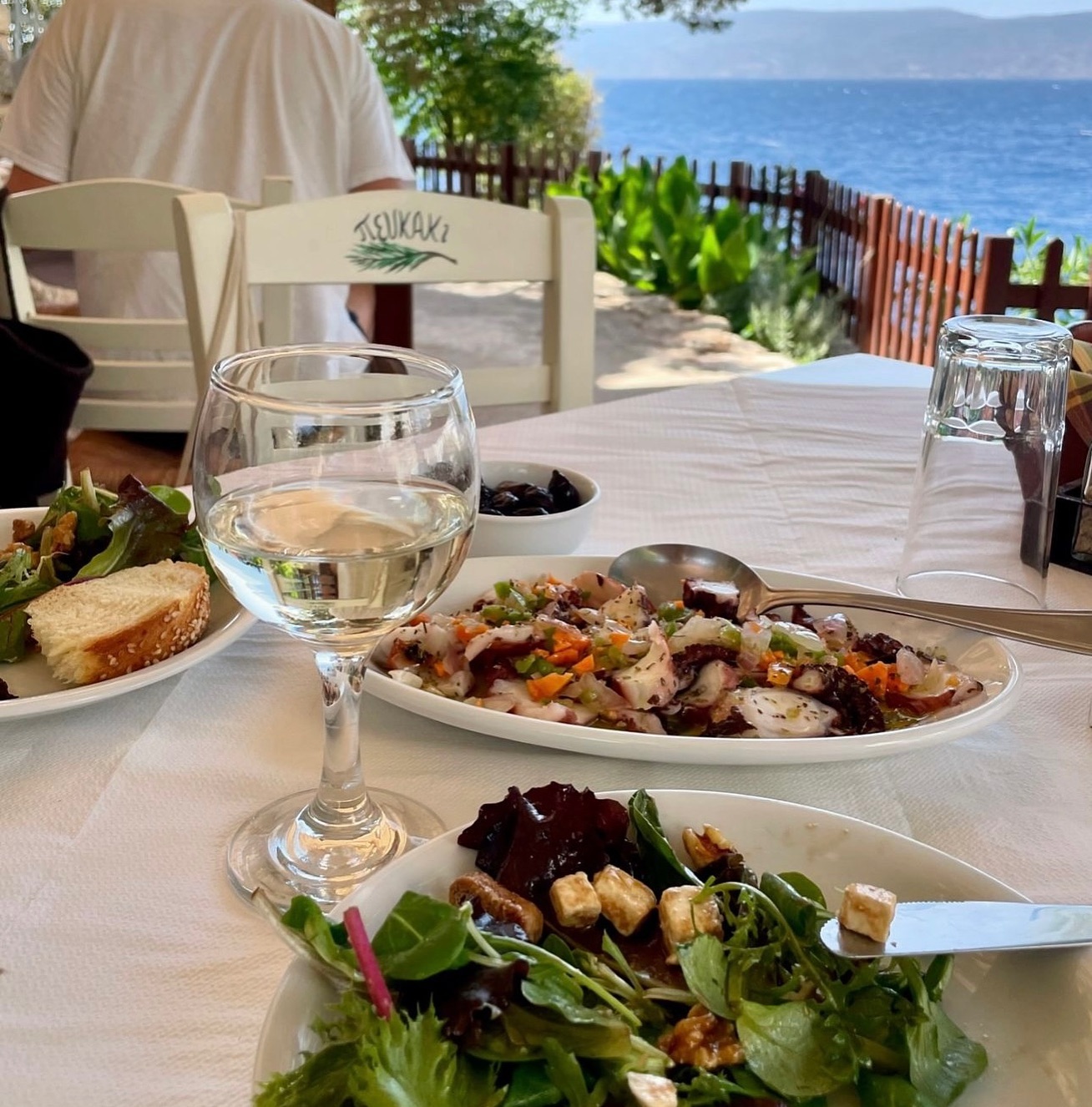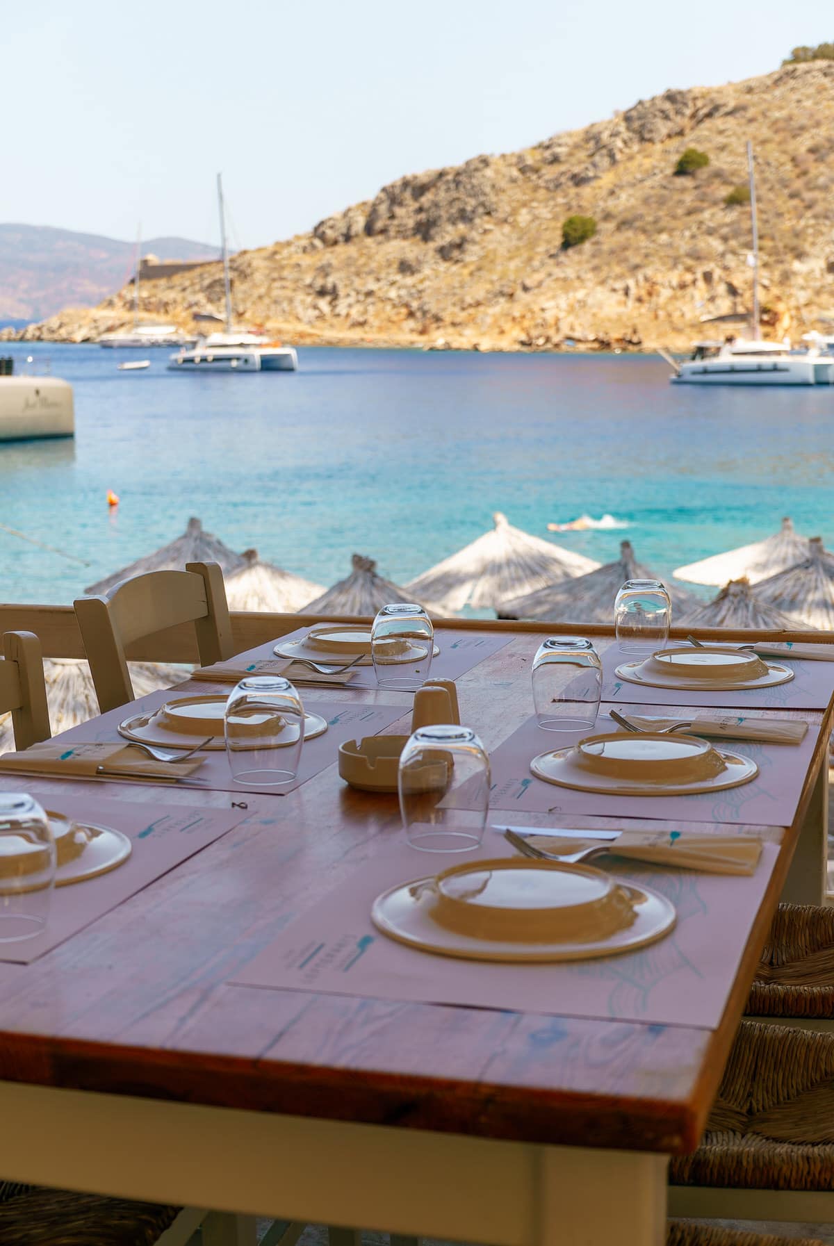 Now situated on an elevated terrace above the port, this restaurant serves a full dinner format built around seafood and home-style Greek cooking. Expect risotto with fresh squid, grilled fish, moussaka, pastitsio with thick béchamel, and structured salads. Meals often conclude with fruit or a house dessert. The layout resembles a private veranda, with white walls and compact table spacing.