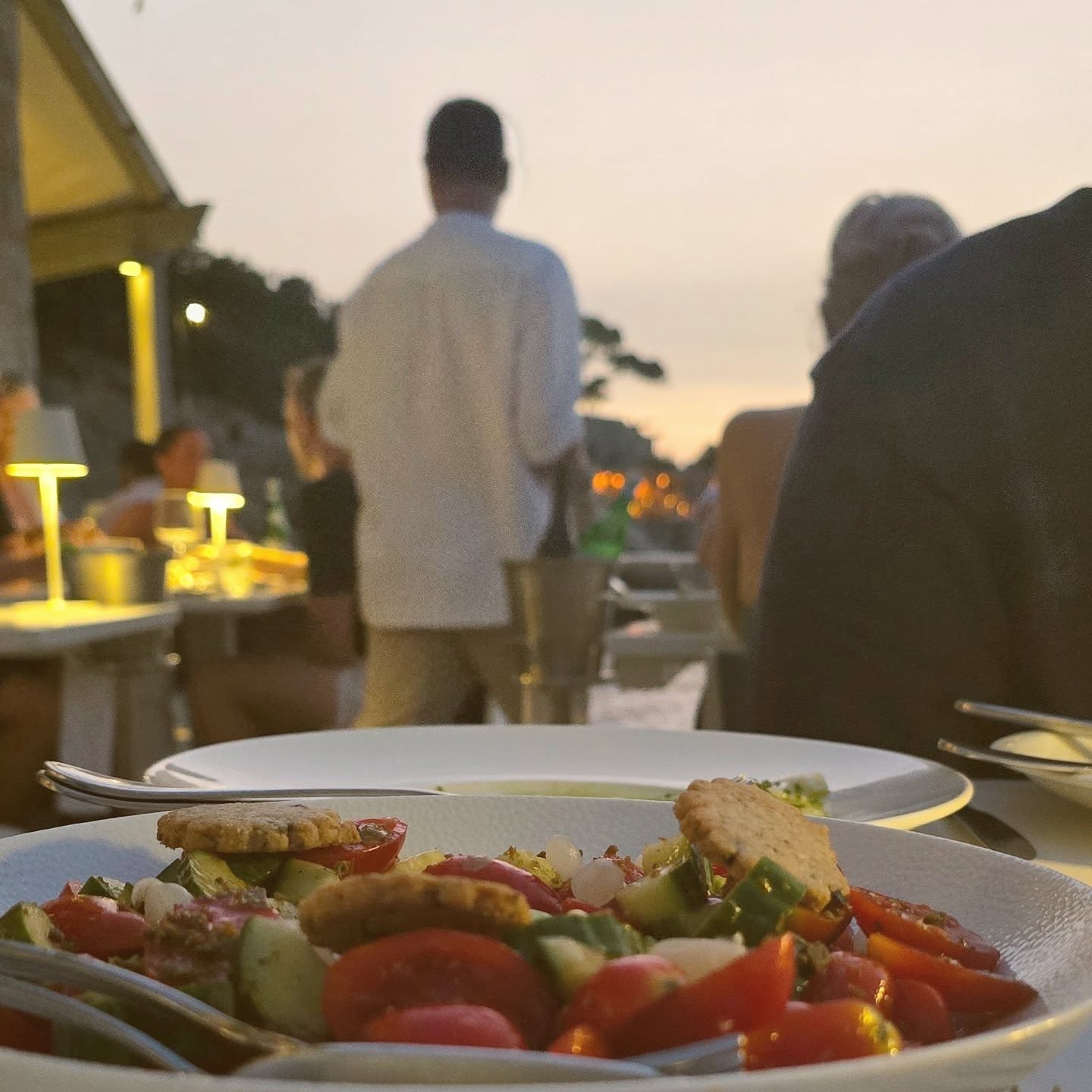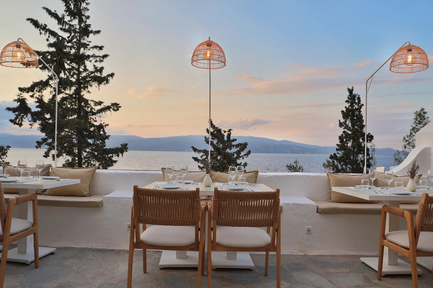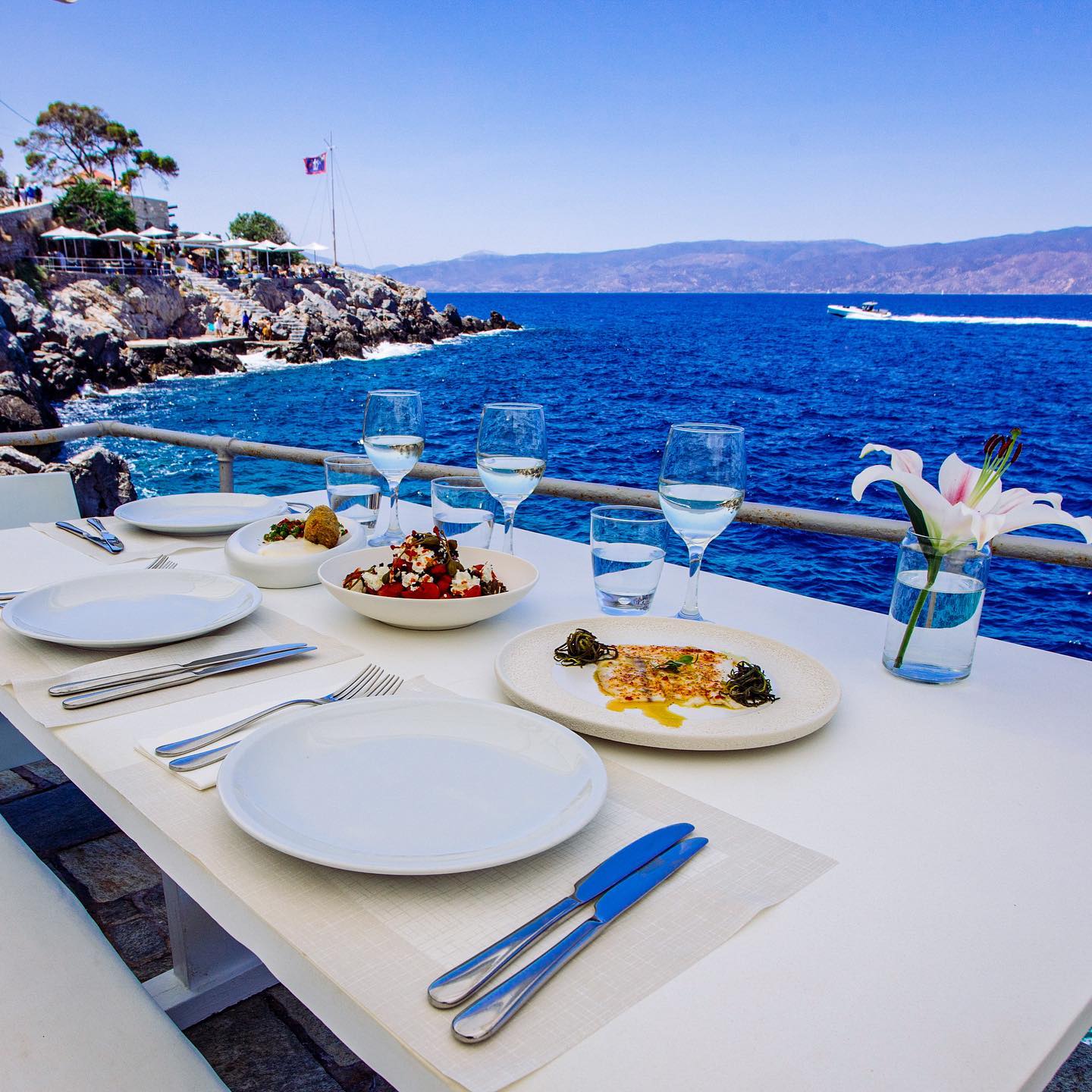 Positioned on the rocks at the harbor’s entrance, this former industrial site functions today as a waterfront restaurant with continuous sea exposure. Lunch and dinner menus reflect modern Mediterranean cooking with Greek sourcing: raw fish preparations, structured salads, seafood pasta, grilled fillets, and composed meat dishes. The deconstructed Greek salad remains a reference point. In summer, the dining service transitions into late-night bar activity. Reservations are advisable in high season.