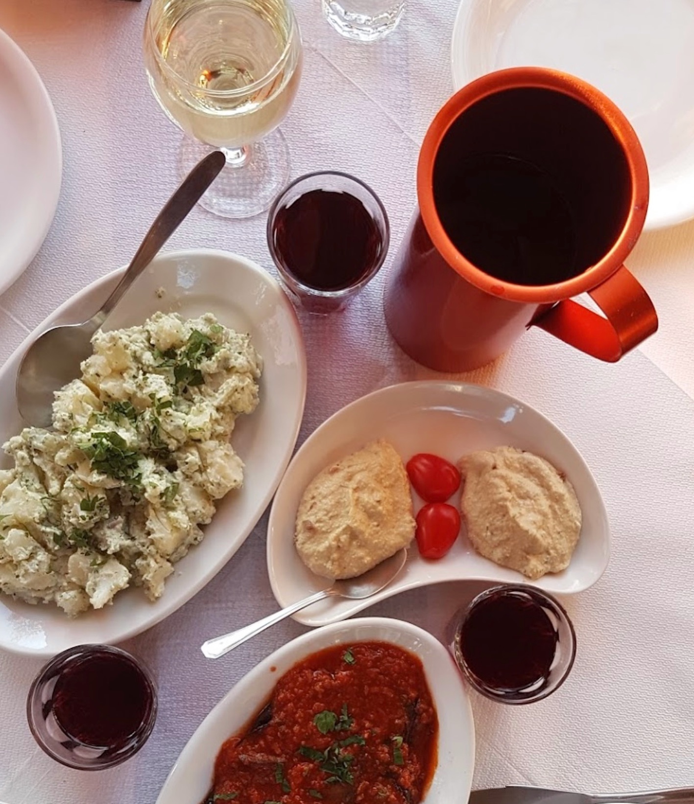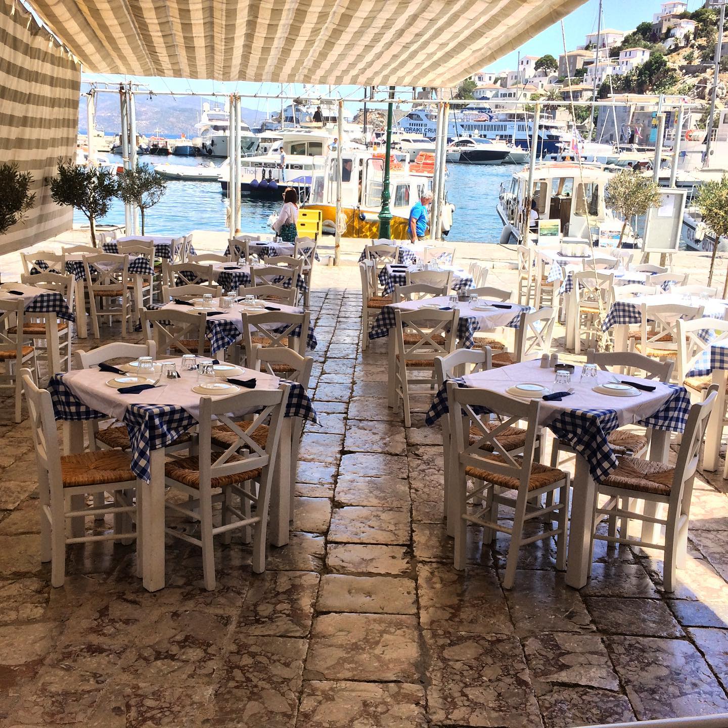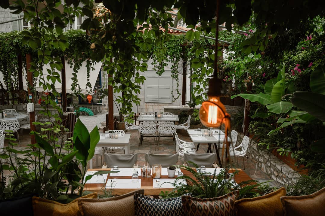 A courtyard restaurant just off the harbor, operating from breakfast through late evening. Morning service includes egg dishes, yogurt, pastries, and coffee, while later hours shift to Mediterranean plates, salads, grilled items, and vegan options. Tables are arranged beneath greenery in a stone-paved yard that buffers harbor traffic. The kitchen handles a wide menu efficiently, making it practical for mixed groups and extended daytime stays.