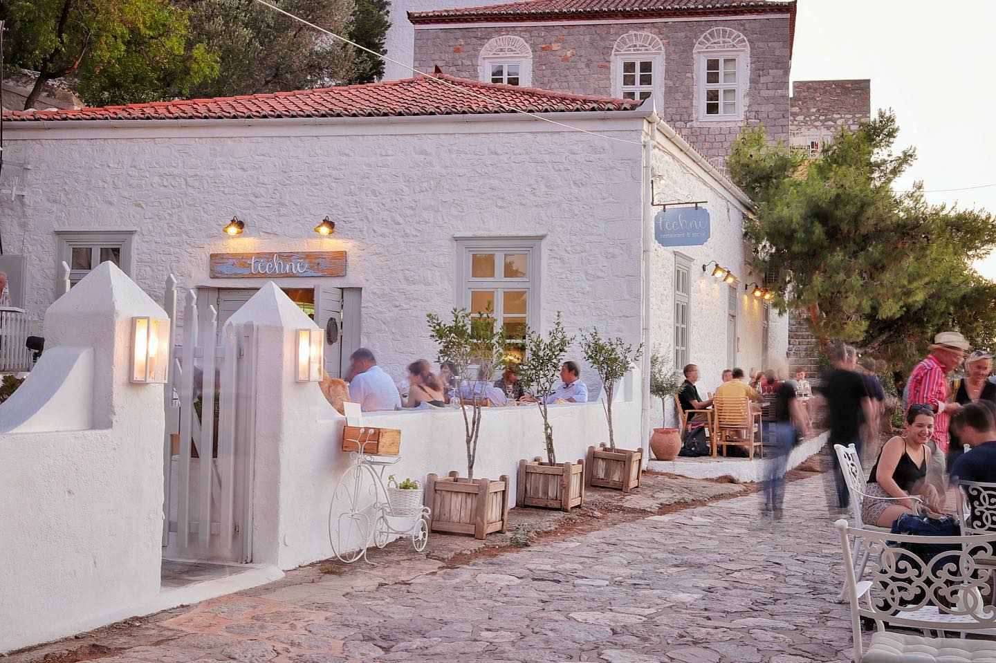 Set inside a restored nineteenth-century boat factory above Avlaki, this dining room combines indoor seating with a sea-facing terrace a short walk from the harbor. The kitchen works seasonally, drawing from Greek and Mediterranean traditions with technical training visible in plating and balance. Dishes often include seafood pasta, lamb preparations, vegetable-led starters, and composed mains that rely on strong raw materials rather than heavy sauces. The cocktail list references Hydra’s literary past, and the wine selection favors Greek producers. Service is structured and paced for dinner reservations.