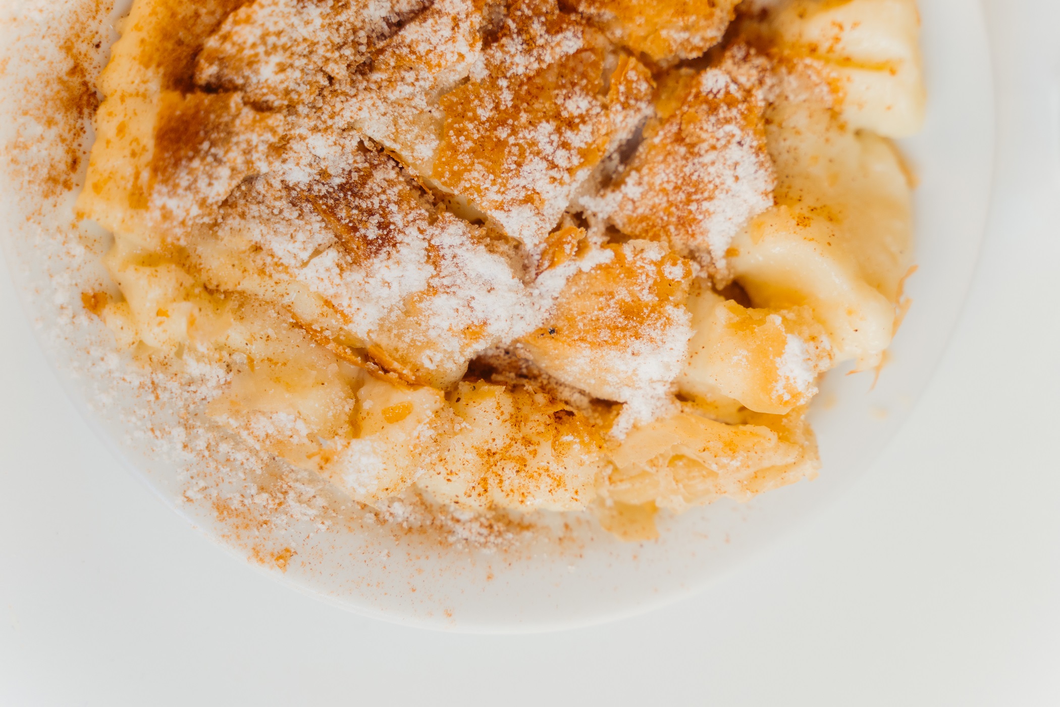 In northern Greece, you usually order “one with cheese” or “one with cream” and it is a very popular snack, served in bite-sized pieces. In addition, it’s sold by weight, one serving is about 160g. Apart from the two most popular flavours, there’s also bougatsa with minced beef, spinach, and also plain, with no stuffing, usually served sprinkled with caster sugar.