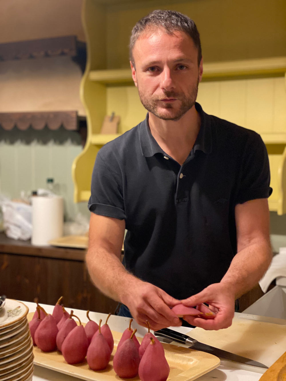 Lunch time approaches and the kitchen top fills with baked aubergines, lamb and chestnut pie, green salad, wild greens, sweet pears in Negoska syrup, the local grape variety. Each bite is full of flavour. Vasilis cooks in a simple way and knows how to add flavour to his dishes. “I try to use seasonal ingredients, use local recipes as my guide, and in general not to mix too many ingredients. I consider it a kitchen success to be able to make delicious dishes with a few, simple, ingredients.”