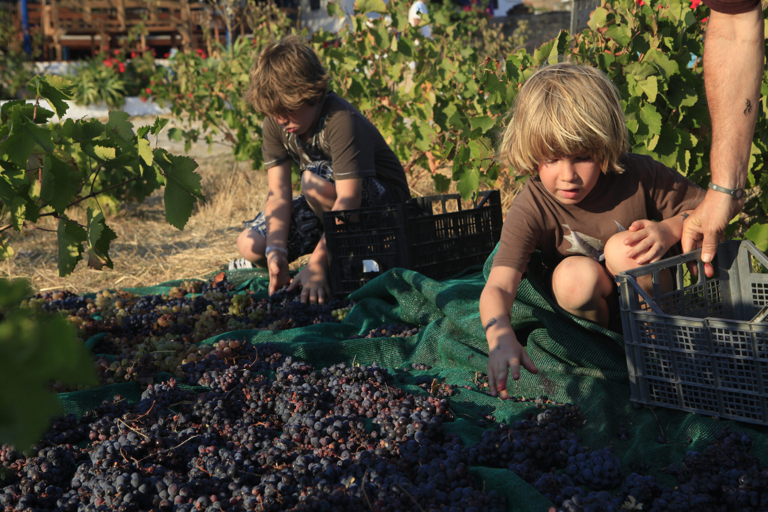 Basically, they can enjoy the landscape, the calm, the authentic images and tastes of the island. Wine tasting includes, apart from our wines, cold dishes made with local ingredients, as well as homemade organic lemonade and a traditional sweet treat of Mykonos. We offer tours of the vineyard daily at 2 pm and 4 pm (upon request the tour can be in French), where the visitors can learn about what makes our vineyard distinct, about our wines, and about the traditional elements of our farm (like the traditional architecture of our wood-burning oven), they can also pick vegetables from our vegetable garden, feed the animals on our small farm, identify the herbs in our bee garden, or even help us with the grape harvest if they want. The contact with the land is a particularly reciprocal “interaction” that always recharges the body and fills it with positive energy. Finally, the vineyard is where the Yummy Pedals bike tours start, so the visitor can spend a whole day, first exploring the island on wheels, and then enjoying the landscape and wine with a mezze.