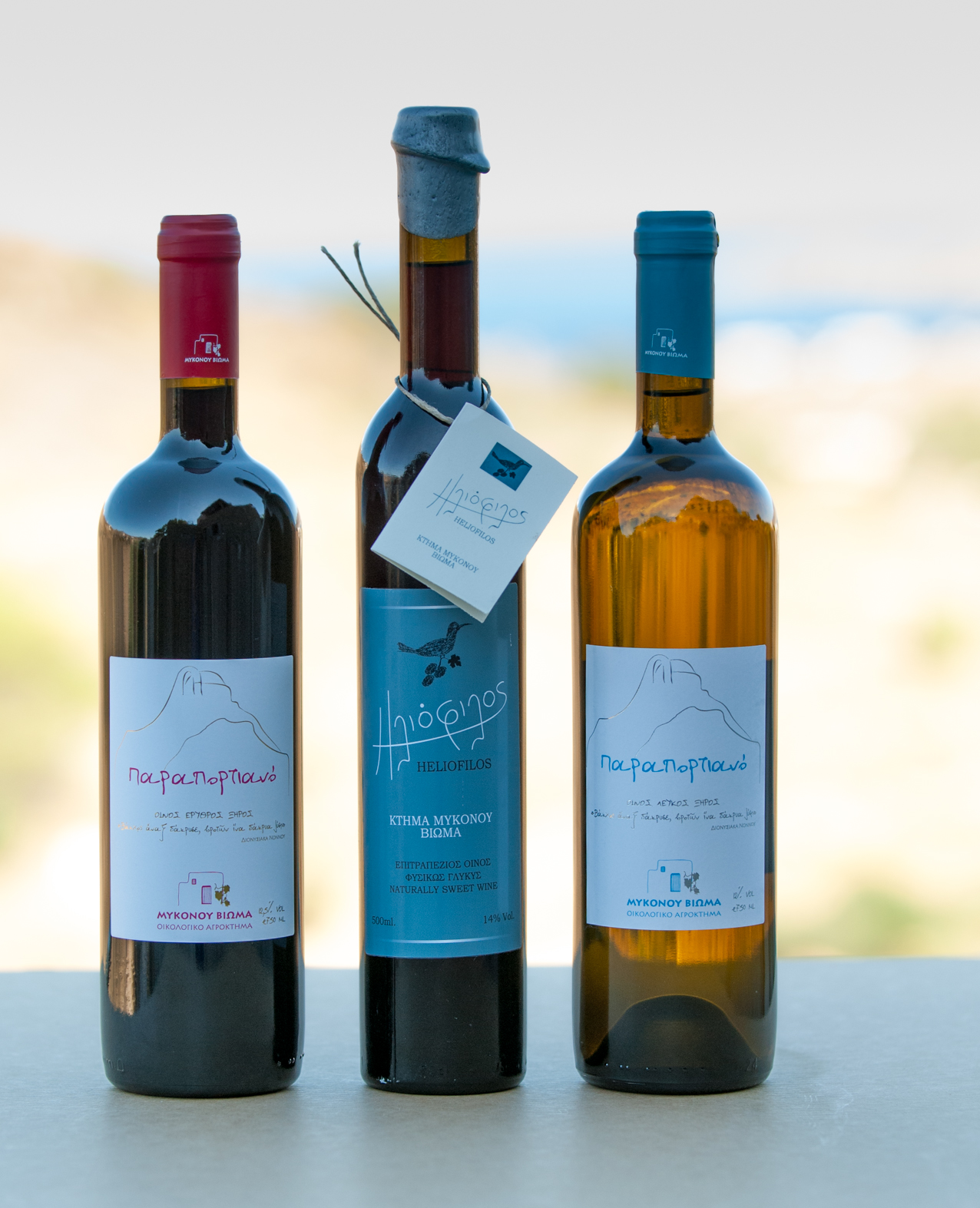 We make four wines: white and red ‘Paraportiano”, “Veggera in Rosé” and our sun-dried grape wine “Heliophilos”. The anhydrous traditional Aegean sea grape varieties that we grow are Asyrtiko and Athiri for the white, Mandilari and Agiannitis for the red, Mandilari for the rosé, and Malagouzia for the sun-dried one. My favourite is by far “Heliophilos” as it is a traditional Mykonian wine, it is produced from grapes sun-dried for 7-10 days and then pressed in our traditional wine press where we revive the grape-stomping practice.