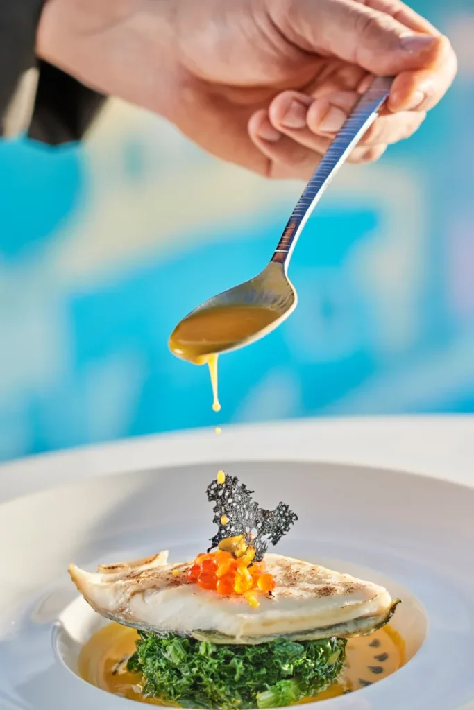 The Lost Sheep: A fine dining hotel restaurant nestled in the shade of an ancient pine tree, surrounded by a courtyard filled with art. Thasian chef Giannis Marinopoulos imaginatively combines luxurious ingredients and local products from small island producers to create interesting dishes using modern techniques: peskandritsa wrapped in pata negra ham, with regal crab eggs in a fish broth flavored with Kozani saffron, lobster “raviolone” with parmesan foam and rooster sauce, Thasian calamari osmotic with lime sorbet and smoked almond, and pheasant fillet with anioloti stuffed with Pecorino Romano, braised pear, and caramelized flambeed fig.