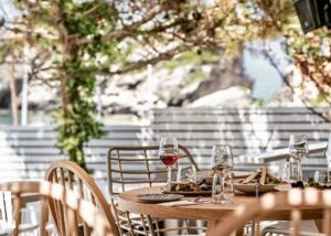 A unique and beautiful beach club in the heart of Corfu’s Old Town, this popular destination is the only beach club in the city with access to Faliraki Beach, offering stunning views of historic sites like the Old Fortress. Open until 2am, it is the perfect place to relax from morning to night with rotating pop-up restaurants, many signature cocktails, and live music events. With bookable tables, loungers, and swim spots, Imbari’s atmosphere, menu, and idyllic location make it a must-visit beach club in Corfu.