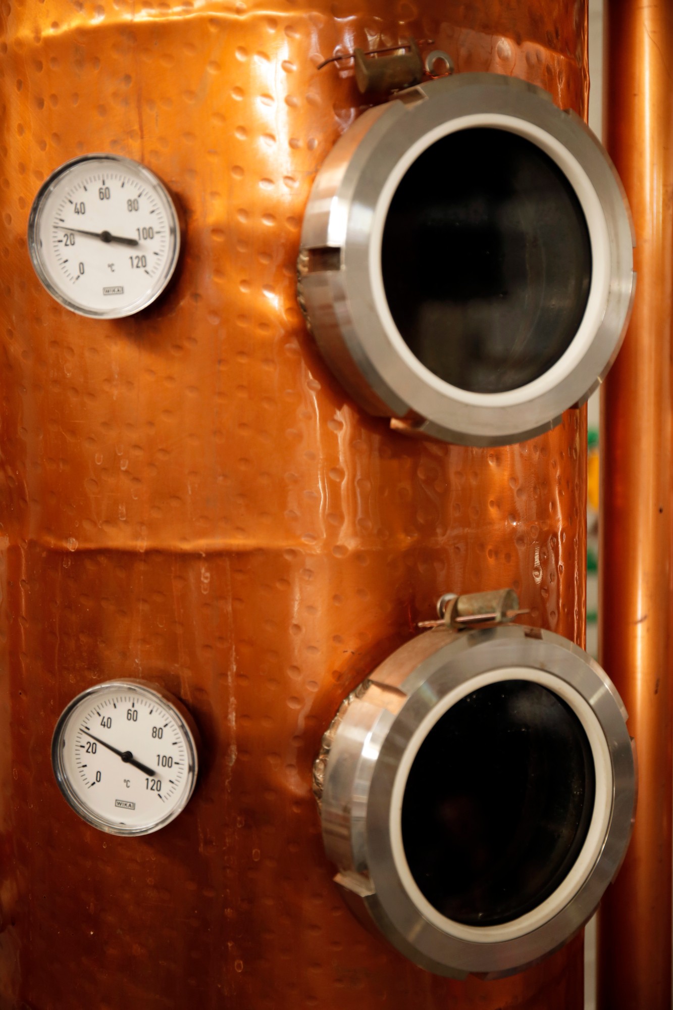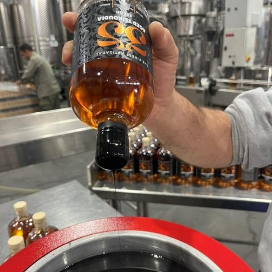 Production begins with the grape harvest in September. After the grapes are pressed for wine, the leftover skins, seeds, and stems—known as strafyla—are collected and stored in barrels or sealed containers. Over several weeks, natural fermentation takes place, as wild yeasts convert sugars into alcohol. When the mash is ready, it is poured into the kazani, the copper cauldron used for distillation.