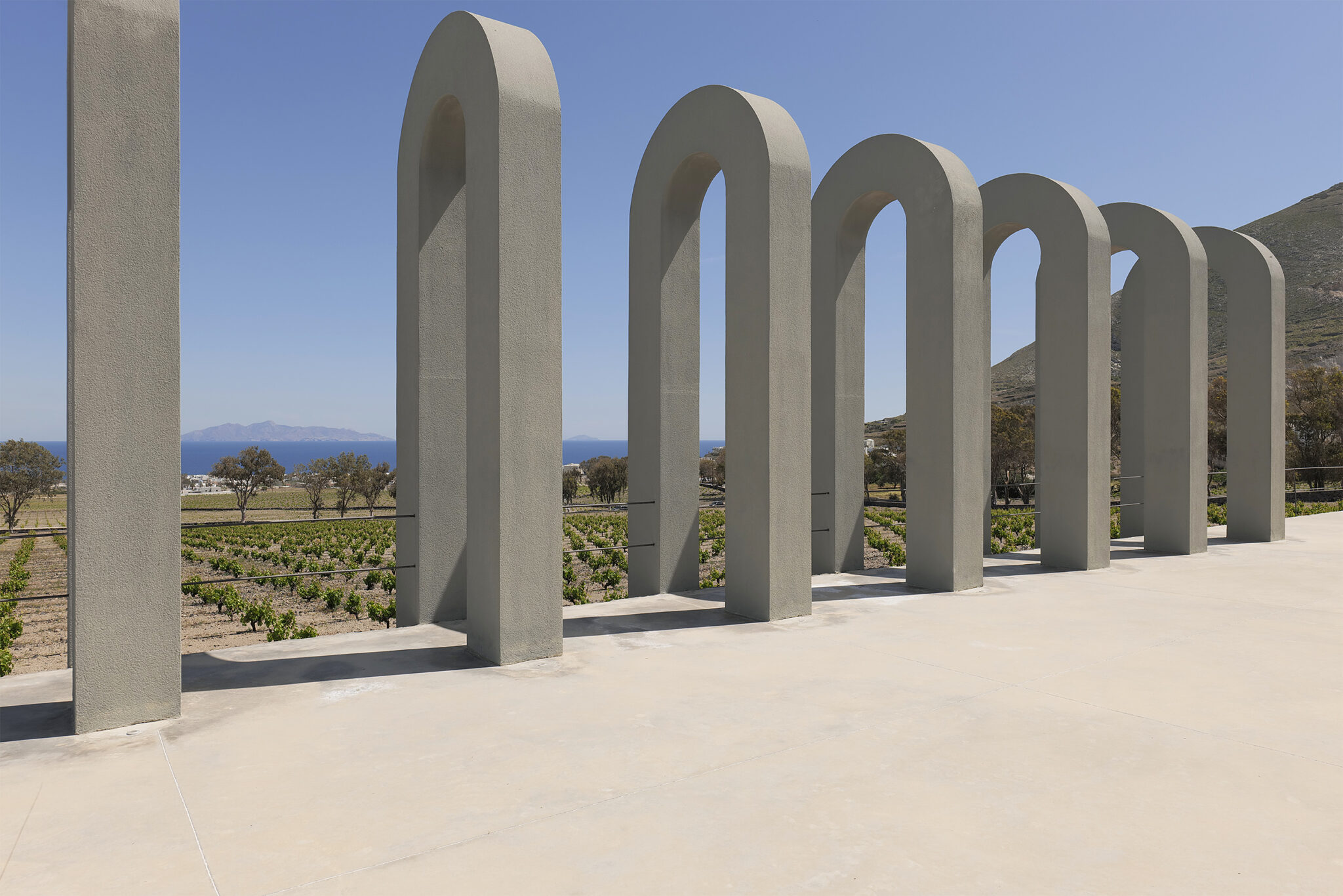 The island’s first industrial winery begins on the highest floor, where traditional vaulted ceilings known as stavrotholaria are immediately visible. This technique, used in Cycladic bridge construction, was masterfully applied by builder Tzortzis Saliveros, also known as Batzanis, who’s behind several architectural gems across the island.